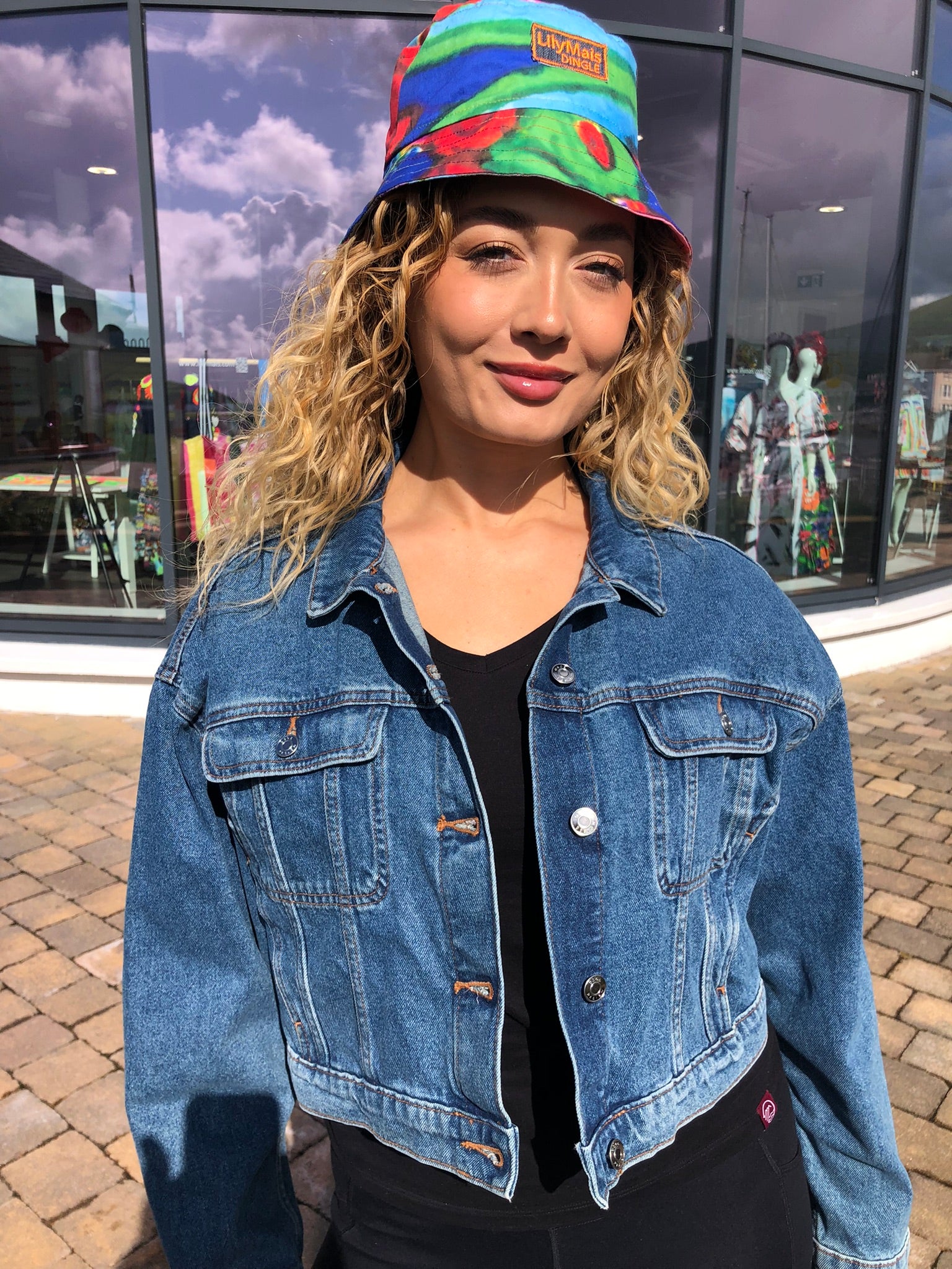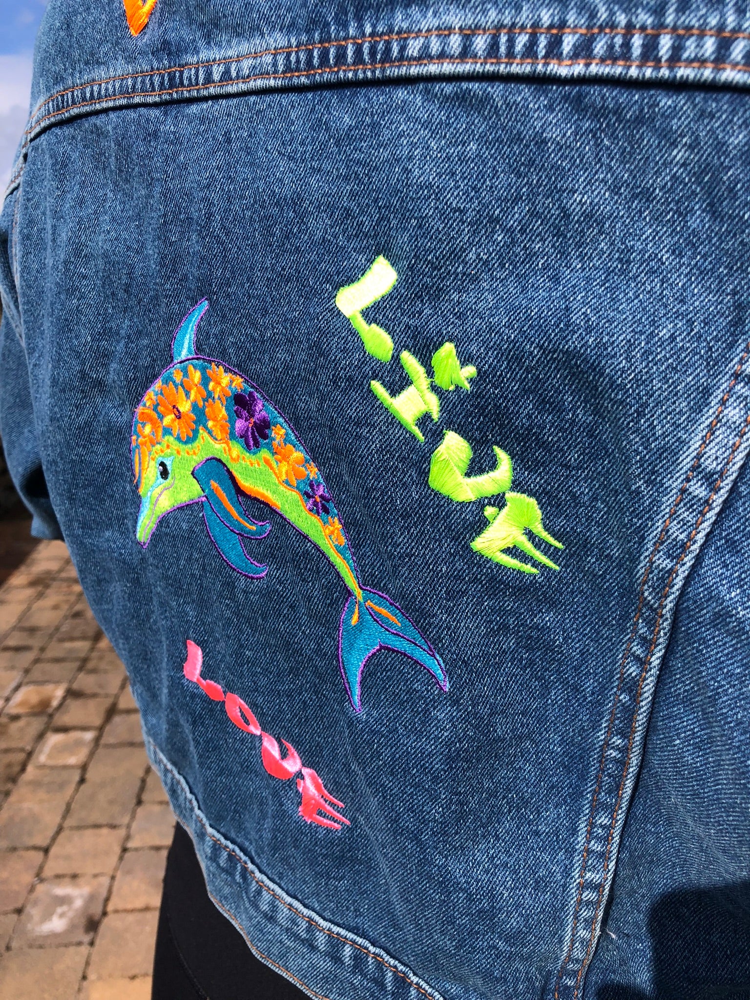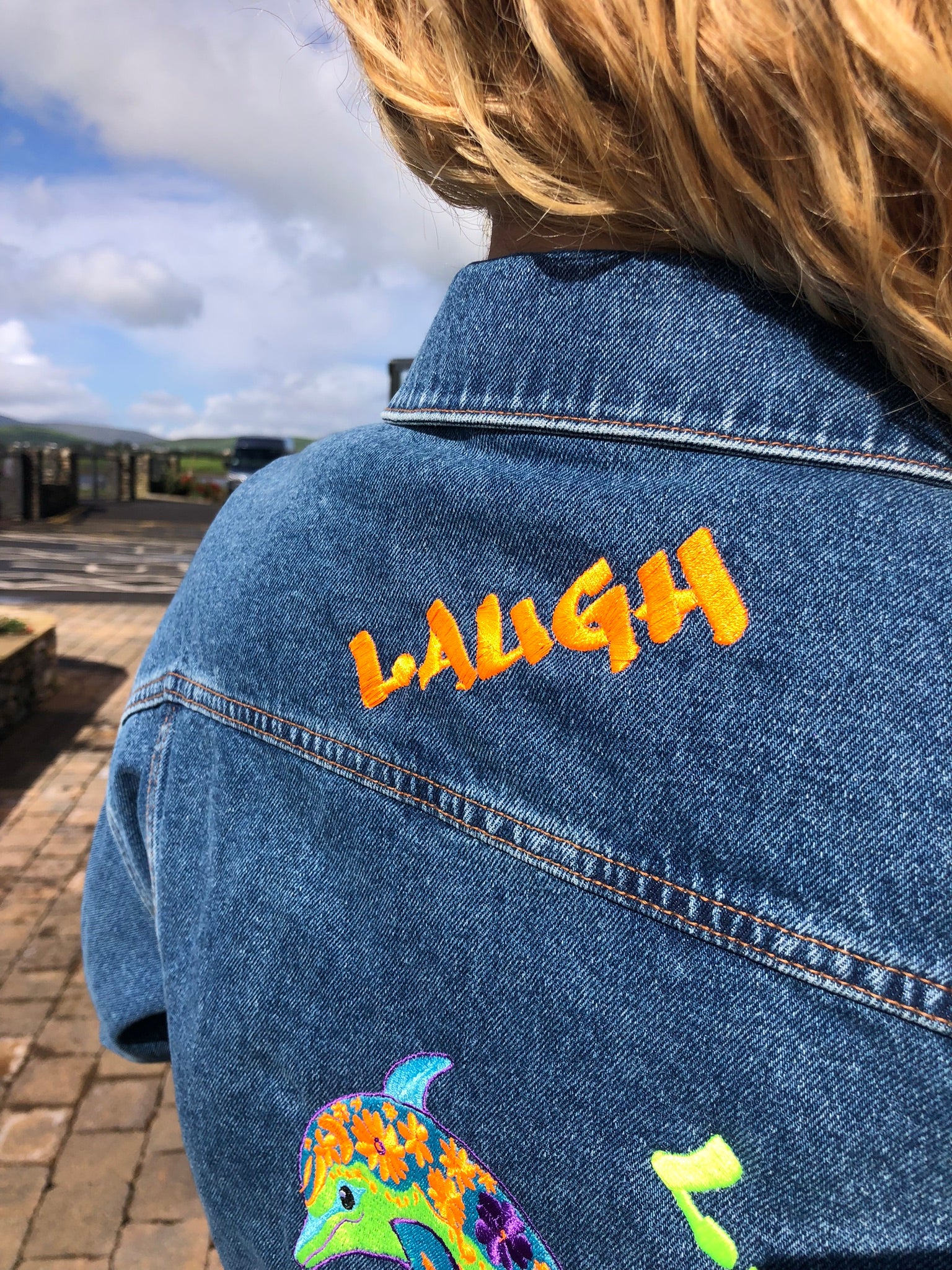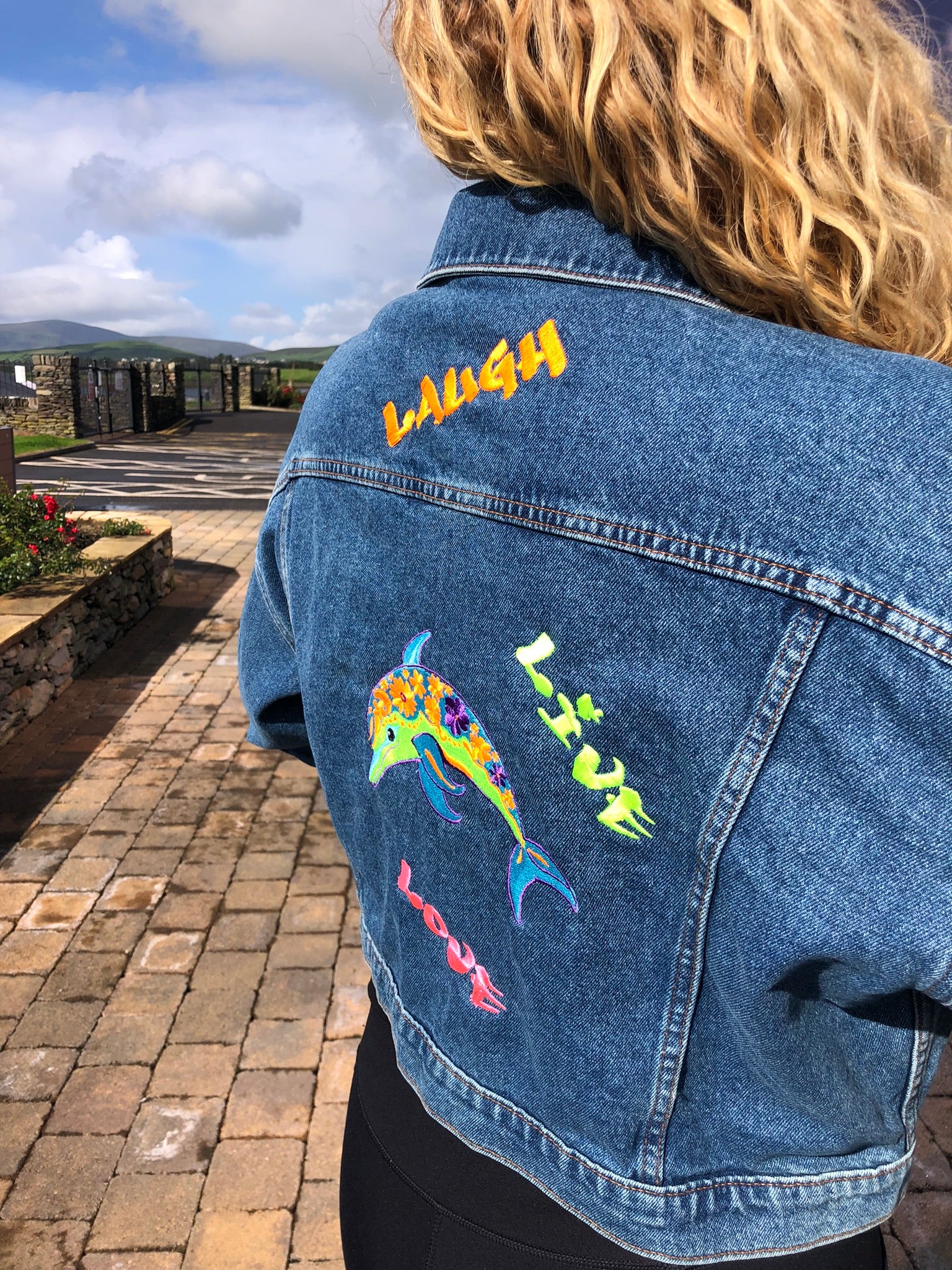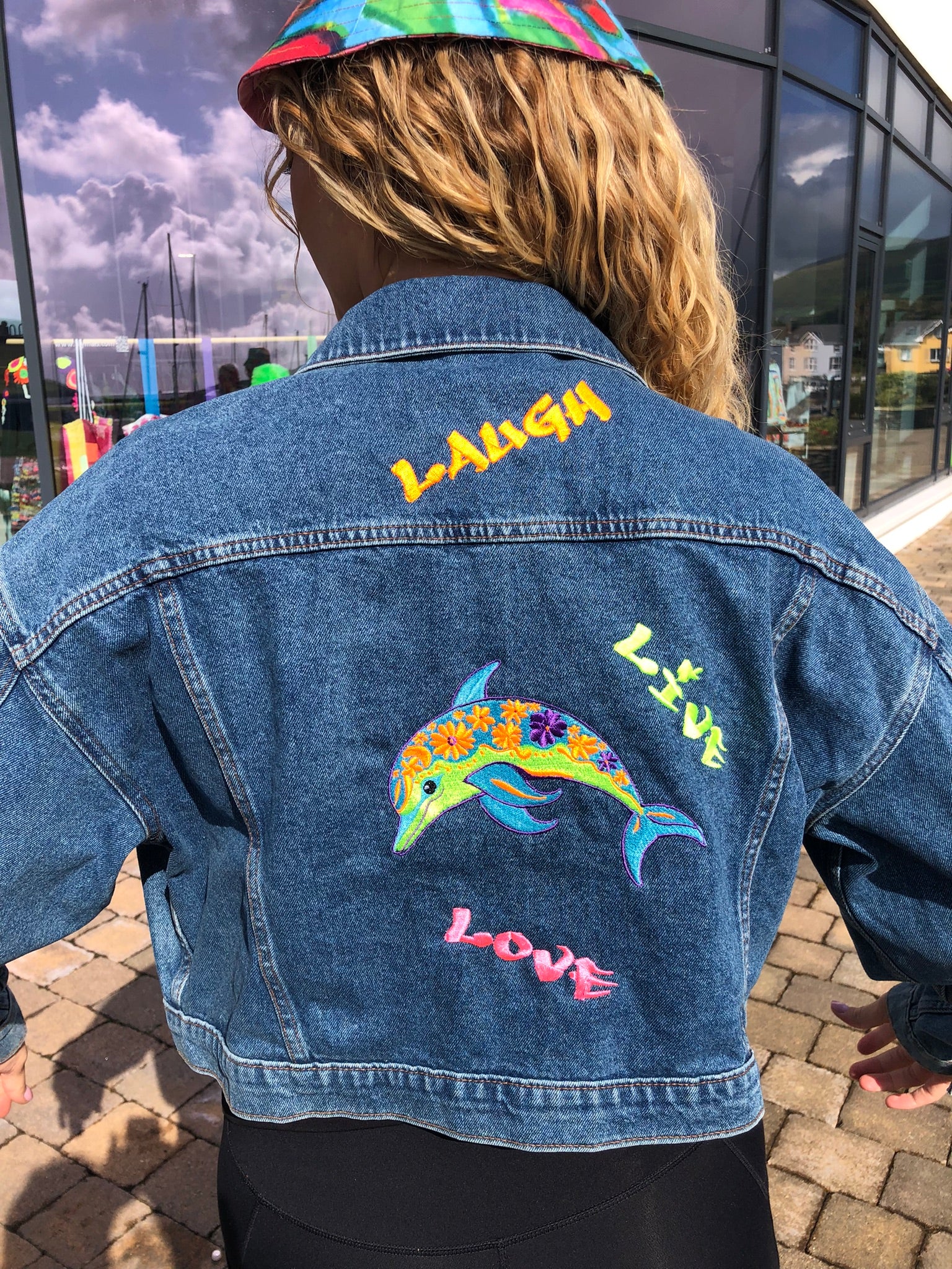 This size small vintage denim jacket has been transformed into a joyful, one-of-a-kind piece bursting with colour and positivity. On the back, a vibrant embroidered dolphin covered in floral patterns leaps across the fabric, surrounded by the words Laugh, Live, Love in bold neon stitching. The playful design captures a sense of freedom and fun while giving new life to classic denim. Sustainably reimagined and hand-finished in Dingle, this jacket is as unique as its wearer — a wearable celebration of creativity, individuality, and the circular spirit.