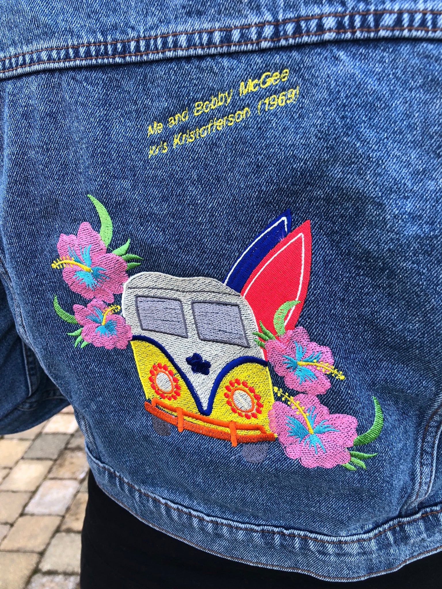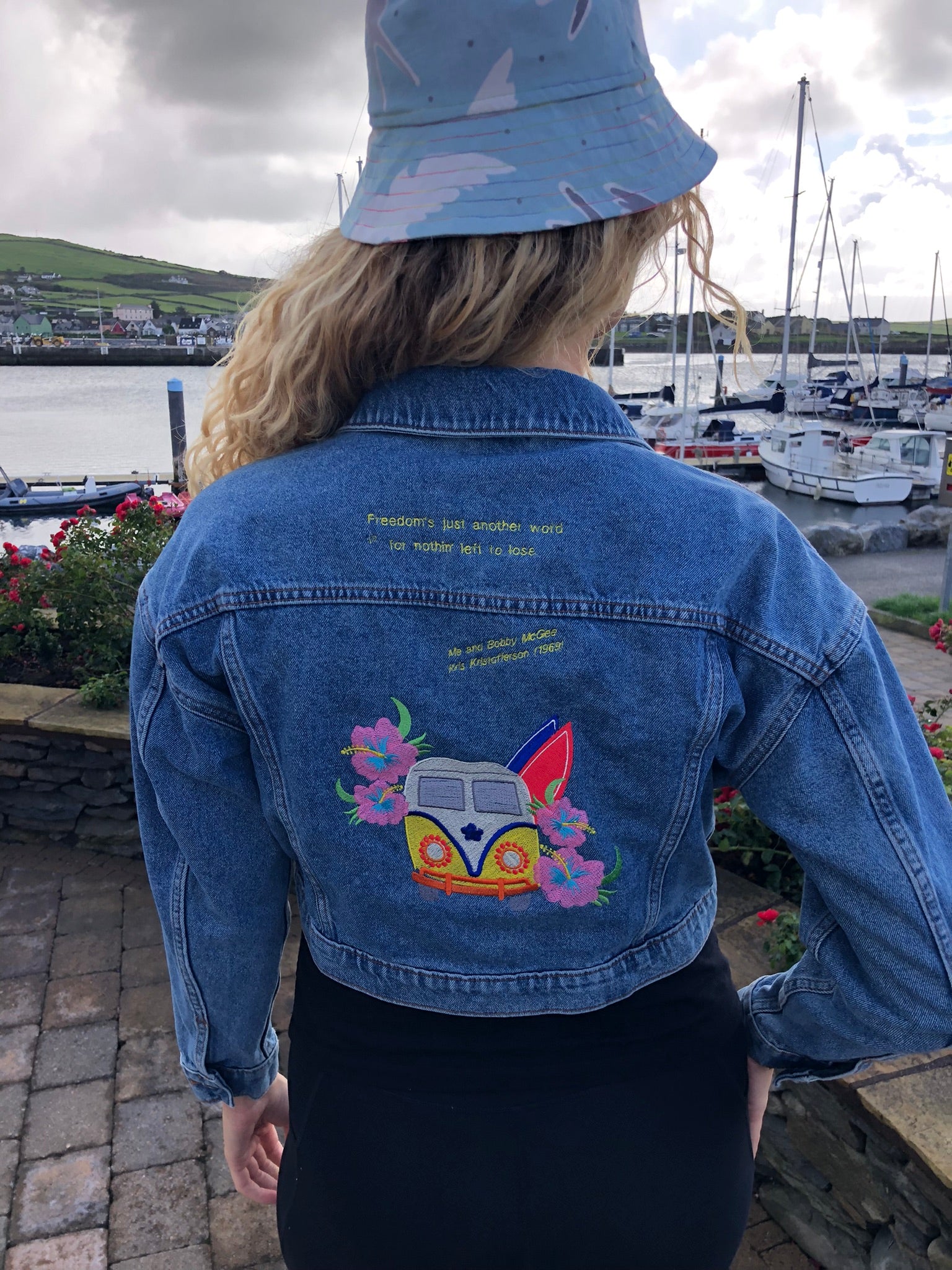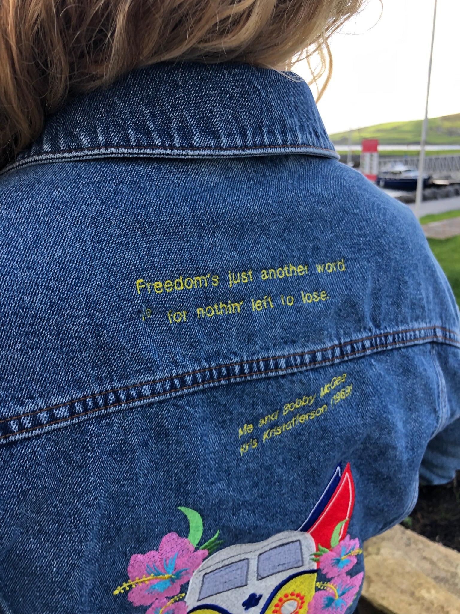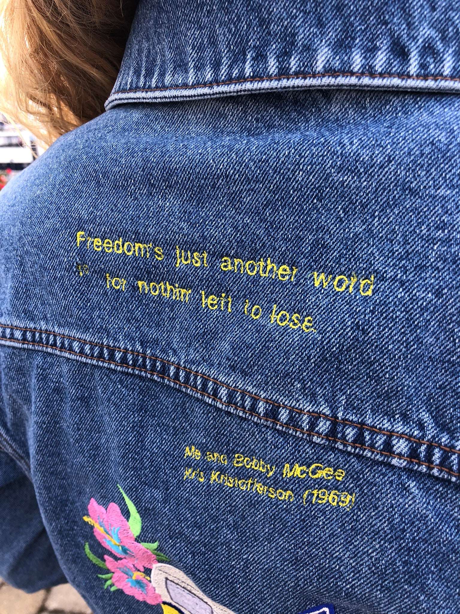 This vintage denim jacket in size small has been transformed into a true one-off, carrying with it both musical heritage and free-spirited style. On the back, the embroidered lyric “Freedom’s just another word for nothin’ left to lose” from Kris Kristofferson’s 1969 classic Me and Bobby McGee sets the tone, stitched in golden thread.