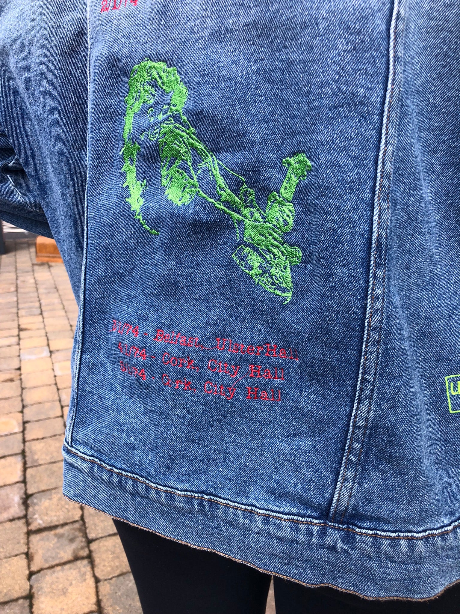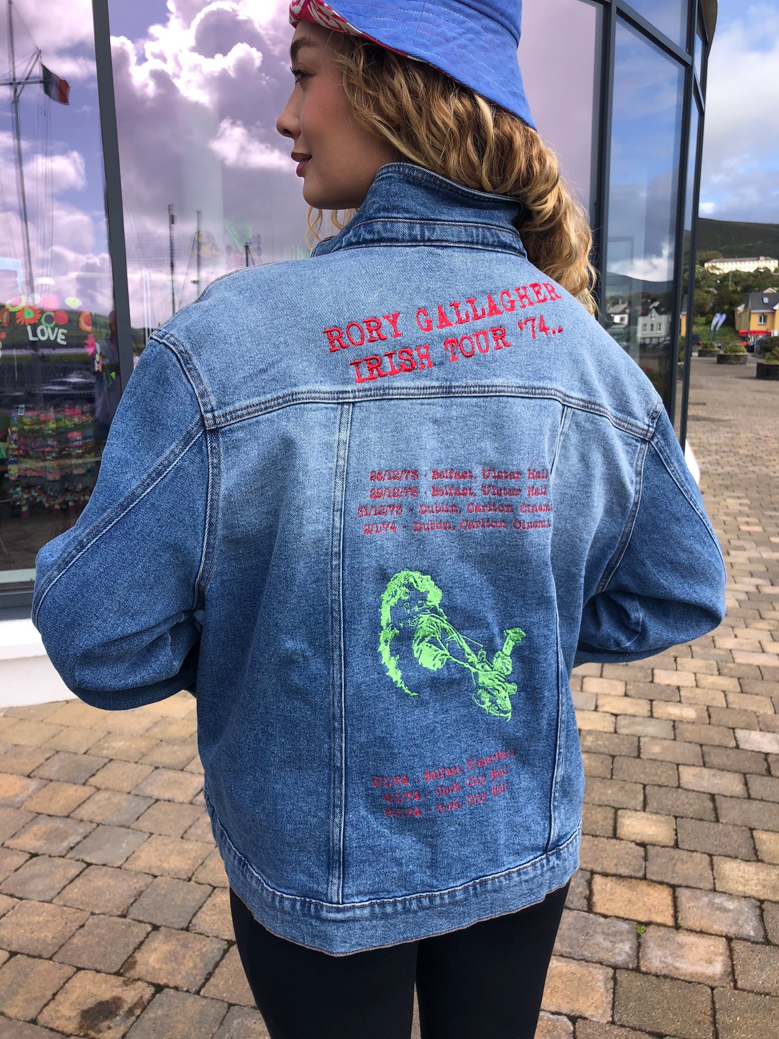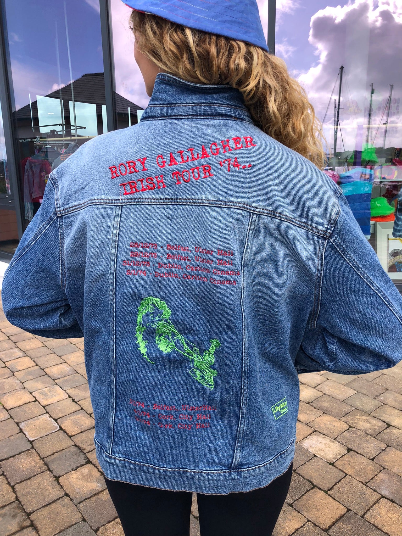 This vintage denim jacket in size large is a true collector’s piece, customised to honour legendary Irish guitarist Rory Gallagher and his iconic Irish Tour ’74 live album. Stitched boldly across the back, the red lettering commemorates the tour, while a striking green silhouette of Gallagher mid-performance captures his raw energy and passion. The jacket also include embroidered tour dates, making it a wearable tribute to one of Ireland’s most influential musicians.