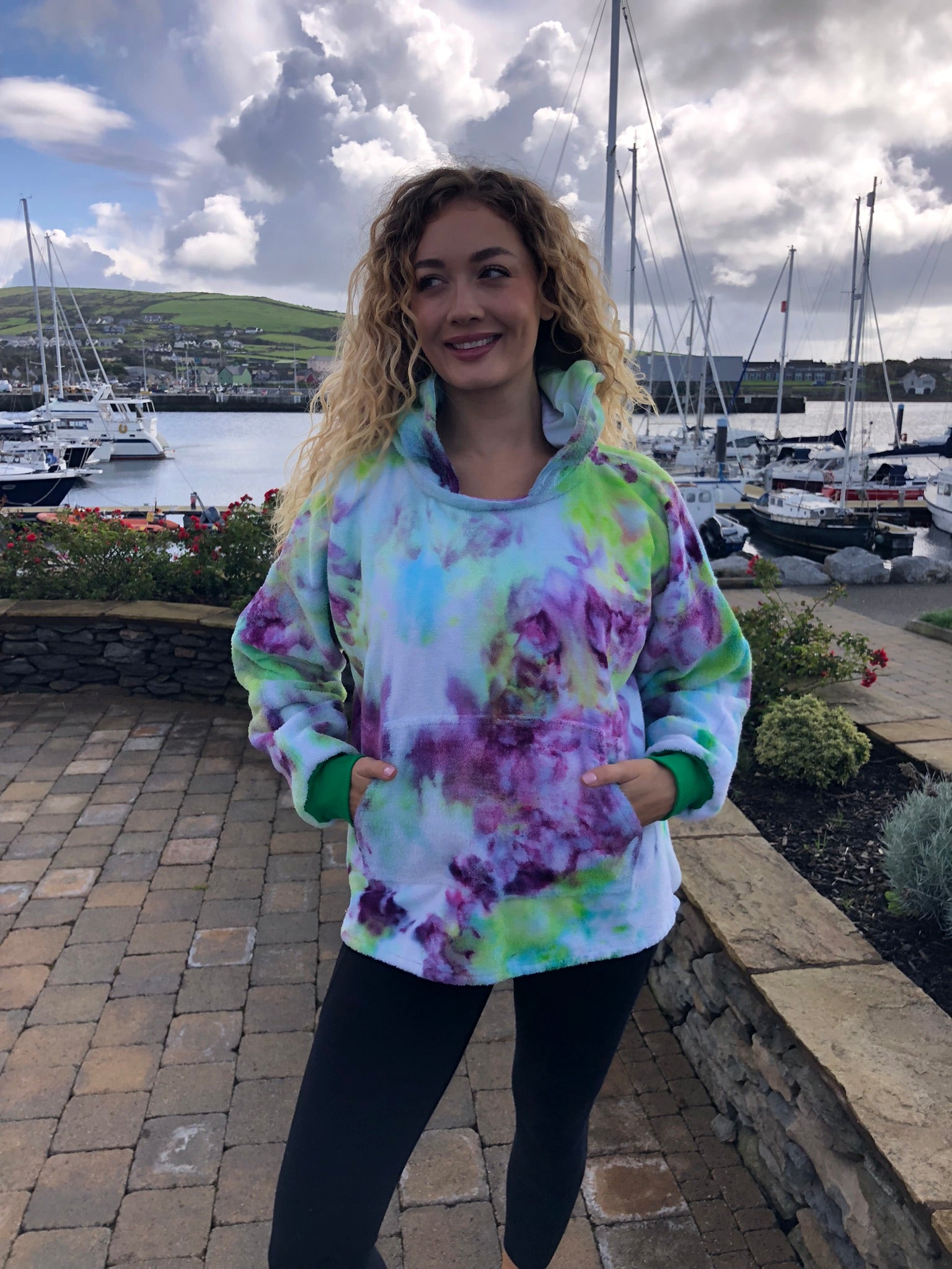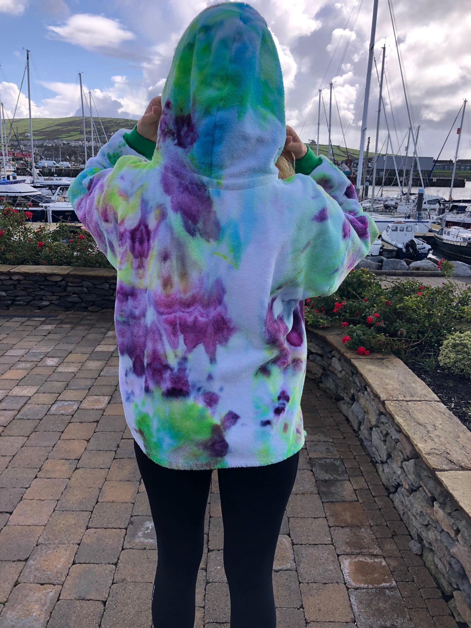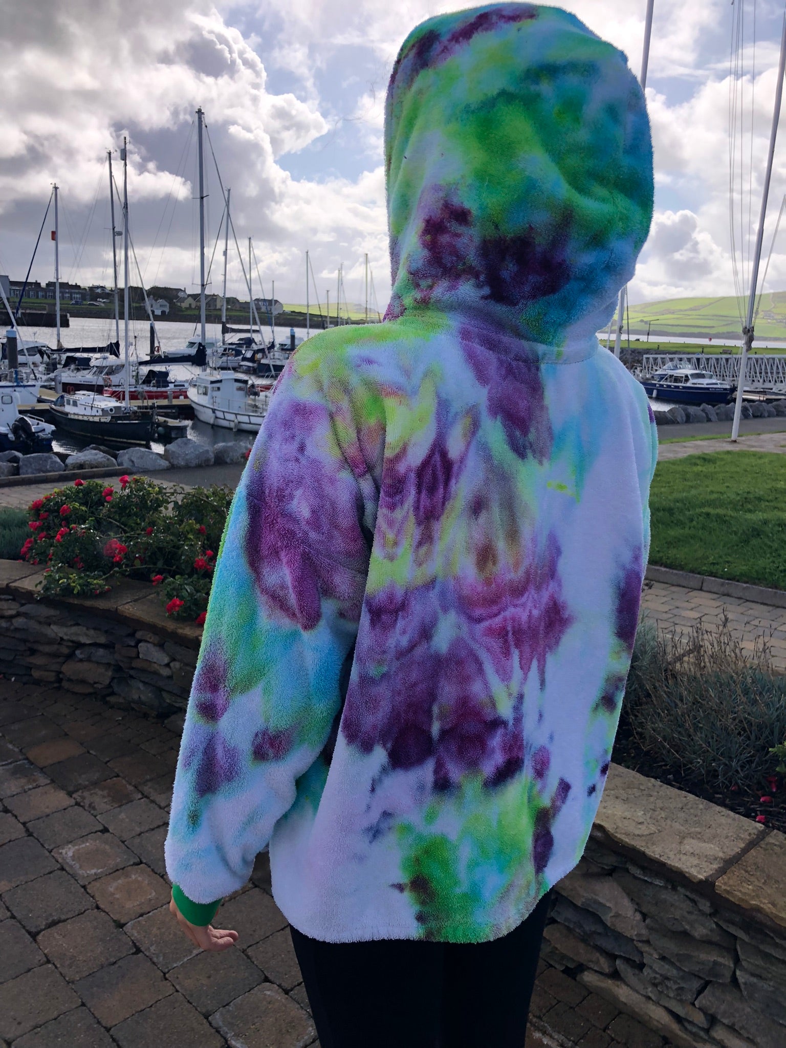 Wrap yourself in warmth and originality with this handmade icedyed hoodie, crafted from 100% upcycled cotton towelling here at LilyMais Dingle. In a striking colourway of lush greens, deep purples, and aqua tones, it’s a wearable work of art that balances comfort with creativity. The hooded design makes it perfect for breezy beach walks, festival nights, or simply staying cosy at home, while the hand-finished details ensure no two are ever the same. Sized large to extra large, this hoodie offers a relaxed and easy fit that celebrates individuality.
