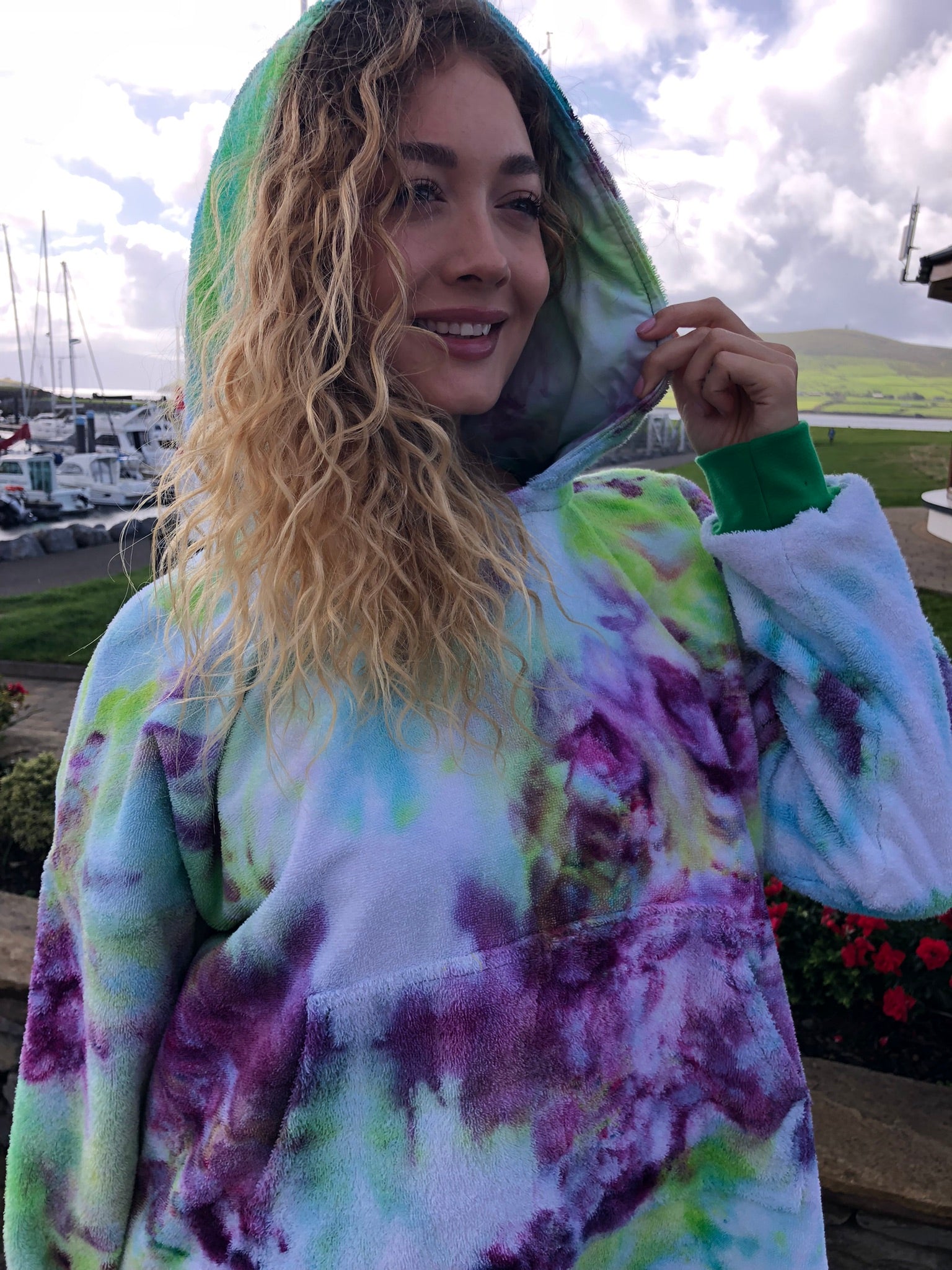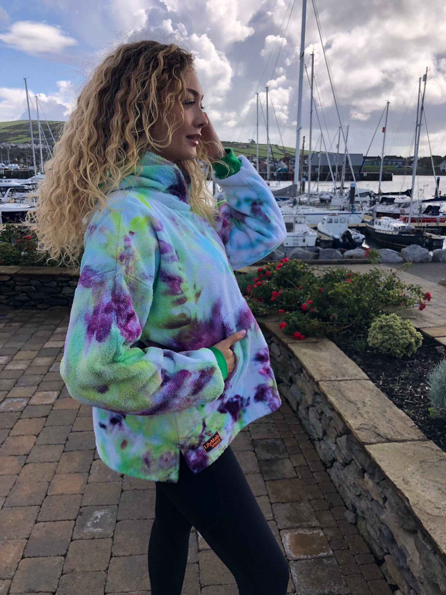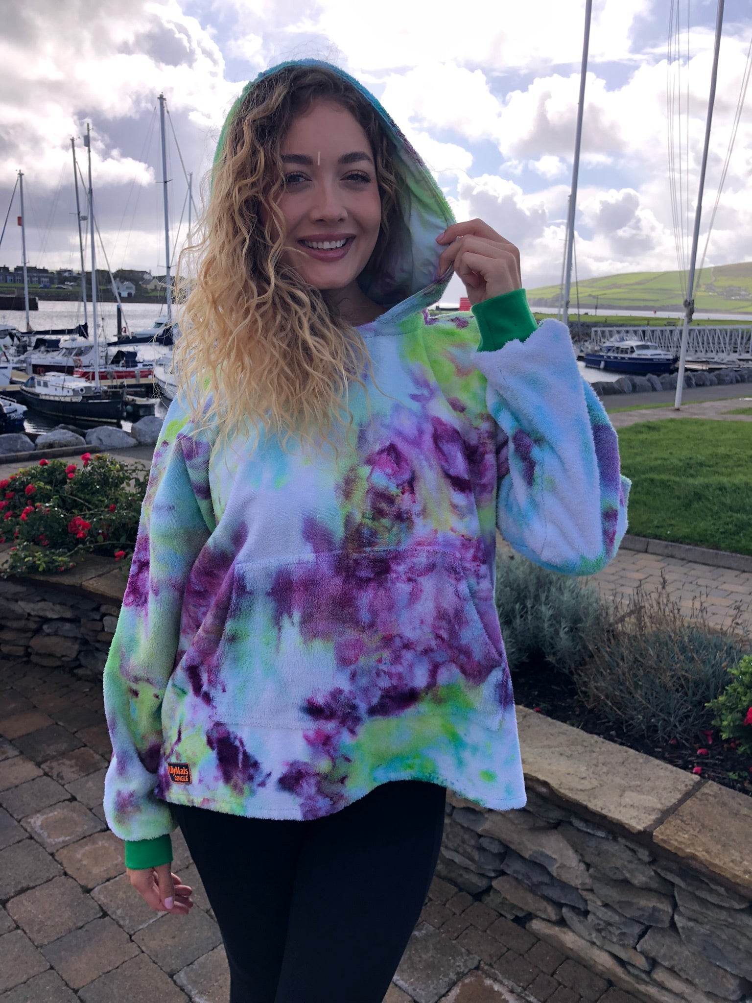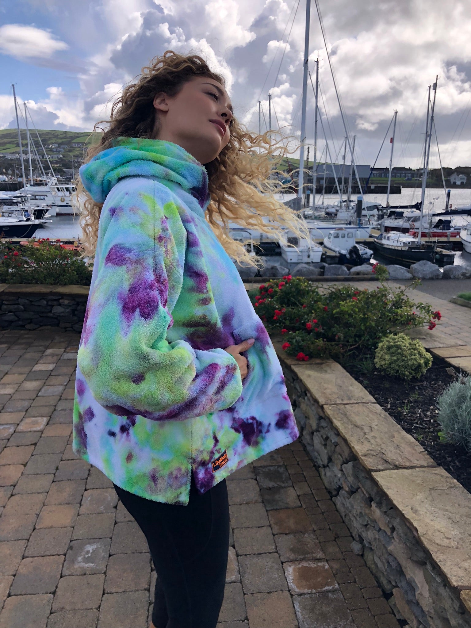 Wrap yourself in warmth and originality with this handmade icedyed hoodie, crafted from 100% upcycled cotton towelling here at LilyMais Dingle. In a striking colourway of lush greens, deep purples, and aqua tones, it’s a wearable work of art that balances comfort with creativity. The hooded design makes it perfect for breezy beach walks, festival nights, or simply staying cosy at home, while the hand-finished details ensure no two are ever the same. Sized large to extra large, this hoodie offers a relaxed and easy fit that celebrates individuality.