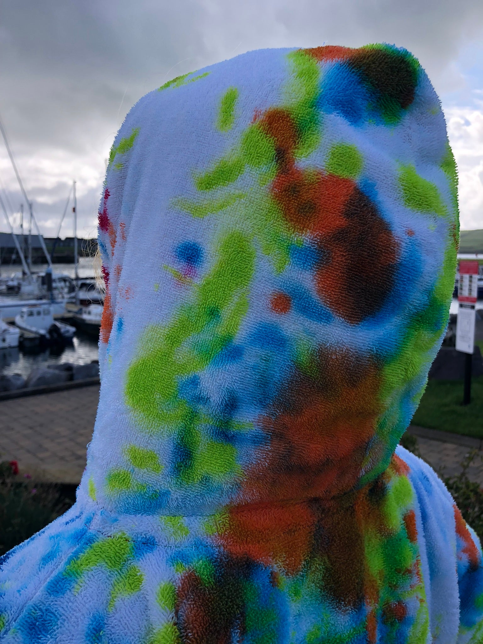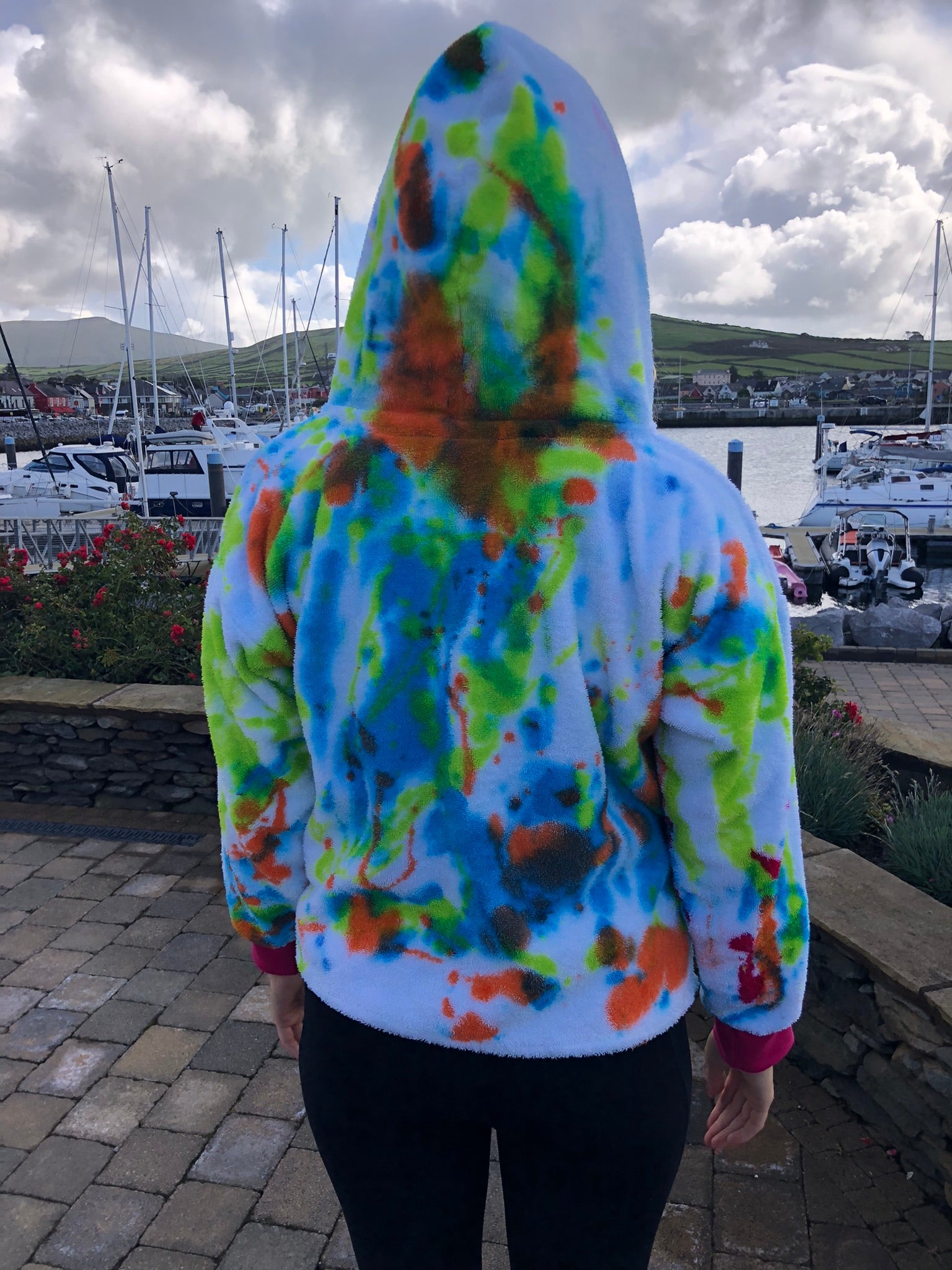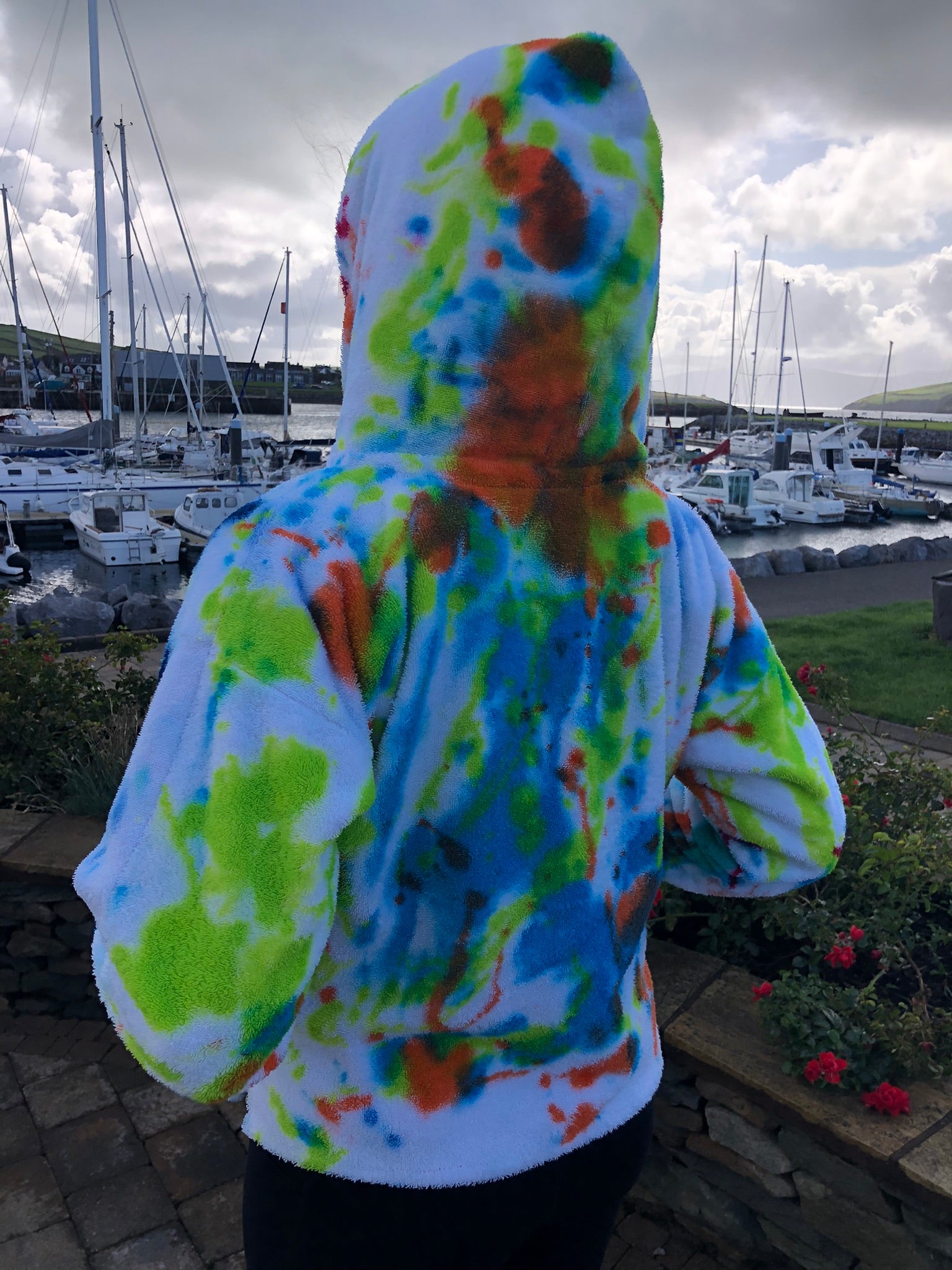 Wrap yourself in warmth, colour, and individuality with this handmade hoodie from LilyMais Dingle. Created from 100% cotton toweling, it is soft, breathable, and wonderfully cozy, making it perfect for layering on cool evenings or brightening up any day. Each piece is hand-painted in a riot of vibrant splashes and strokes, ensuring that no two are ever the same—your hoodie is a true one-of-a-kind. Designed and handmade with care in Dingle, it embodies creativity, sustainability, and the joy of wearing something as unique as you are. This piece is size small/medium, shown on a size 10 model for reference.