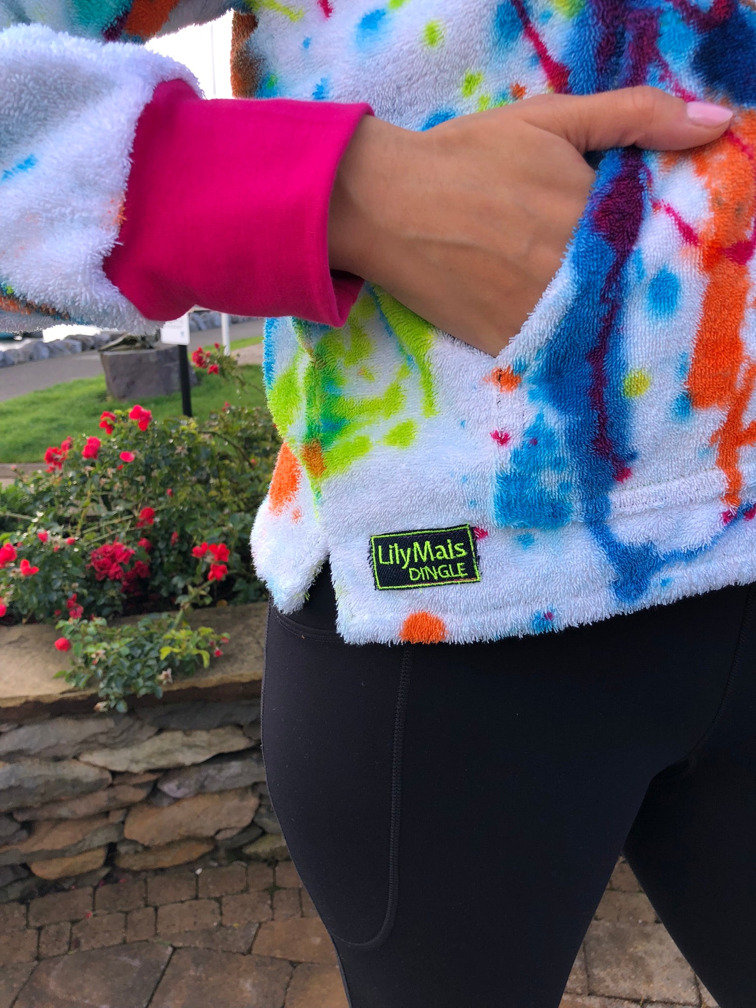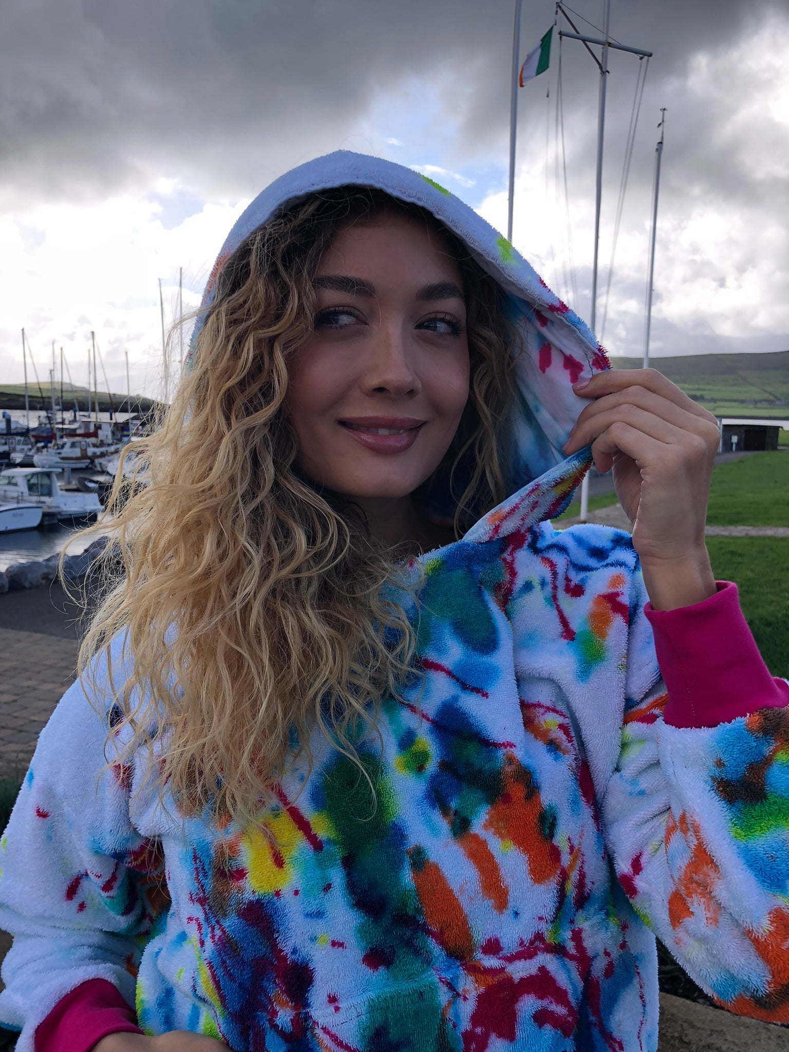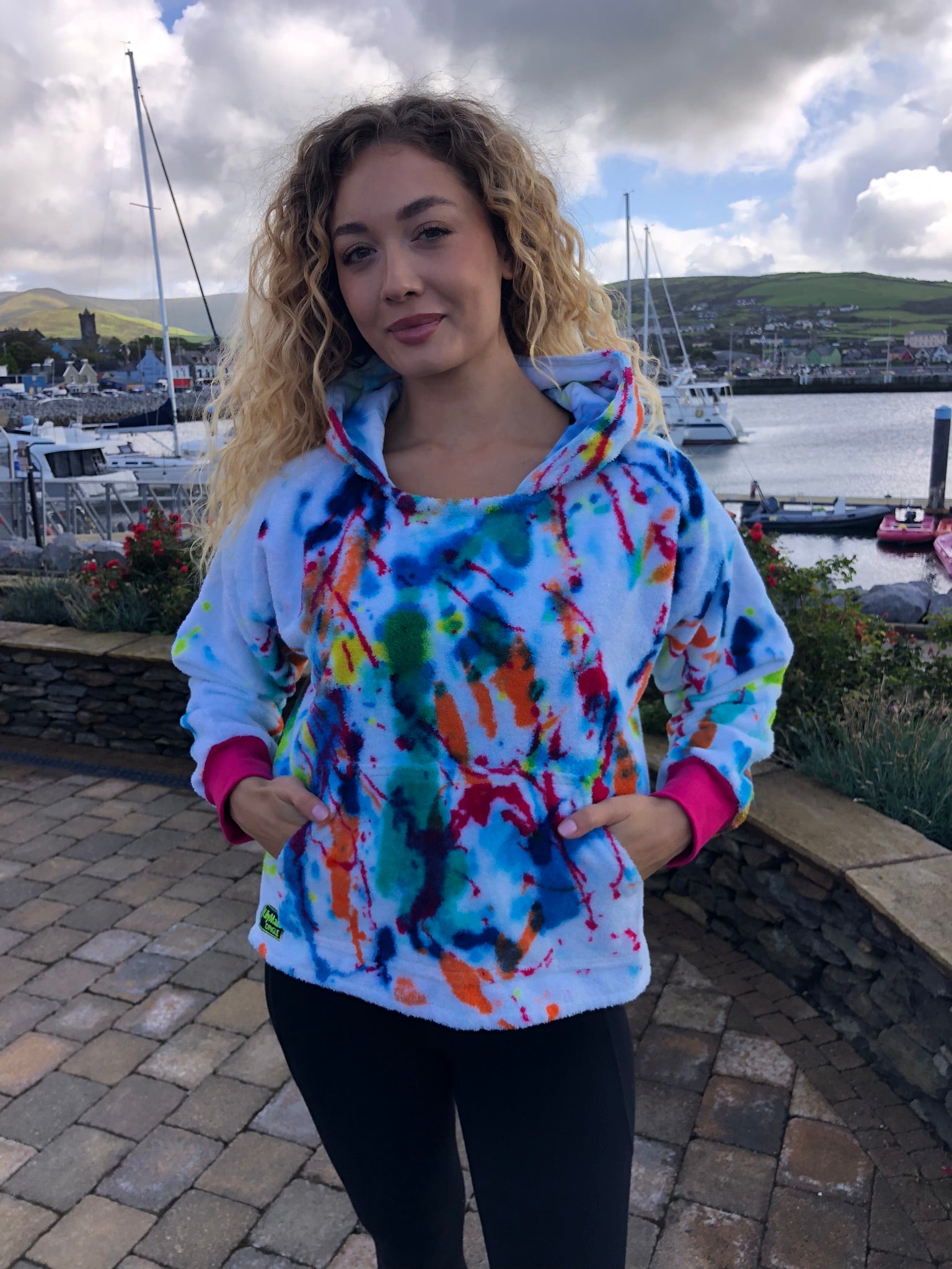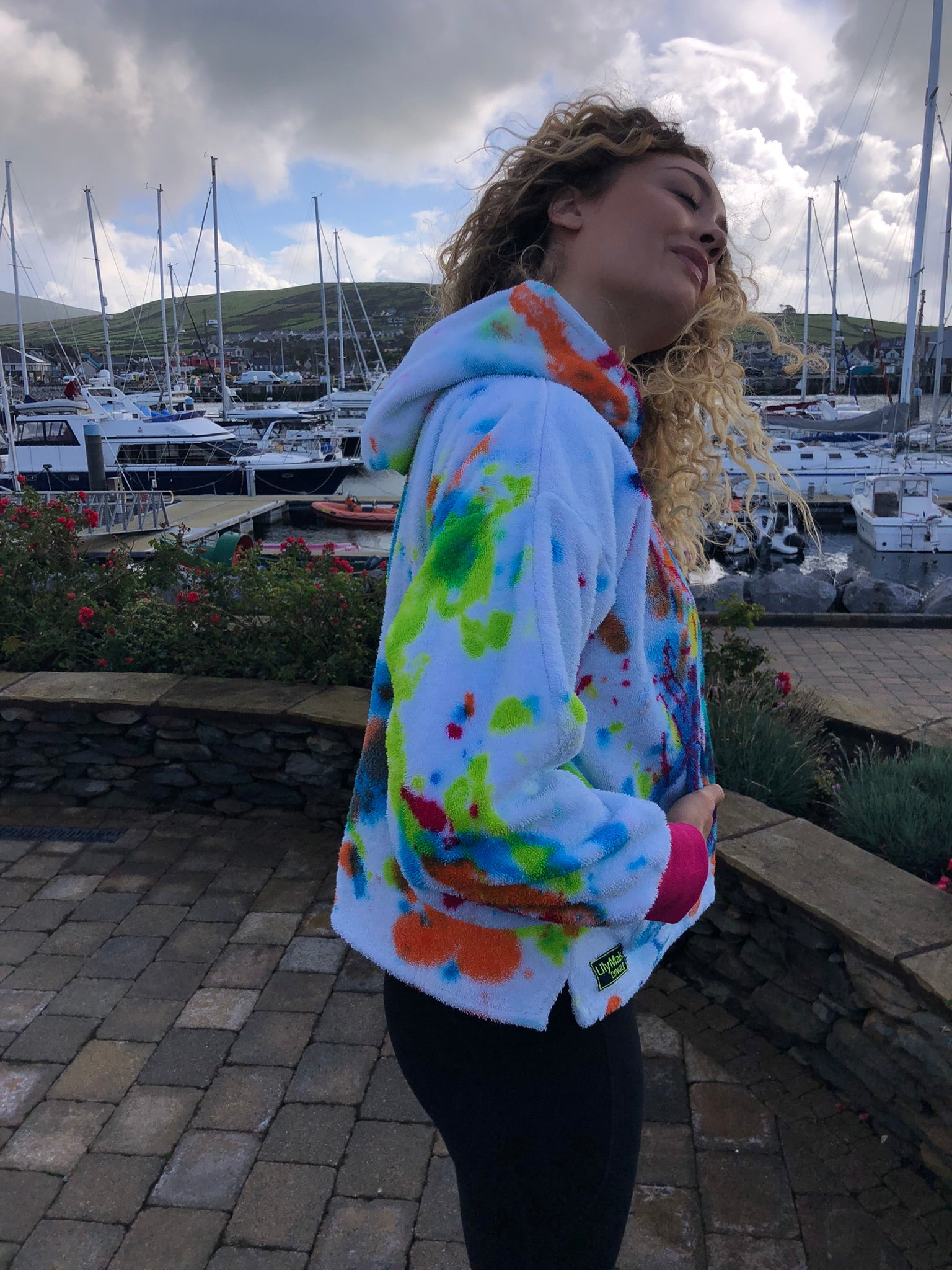 Wrap yourself in warmth, colour, and individuality with this handmade hoodie from LilyMais Dingle. Created from 100% cotton toweling, it is soft, breathable, and wonderfully cozy, making it perfect for layering on cool evenings or brightening up any day. Each piece is hand-painted in a riot of vibrant splashes and strokes, ensuring that no two are ever the same—your hoodie is a true one-of-a-kind. Designed and handmade with care in Dingle, it embodies creativity, sustainability, and the joy of wearing something as unique as you are. This piece is size small/medium, shown on a size 10 model for reference.
