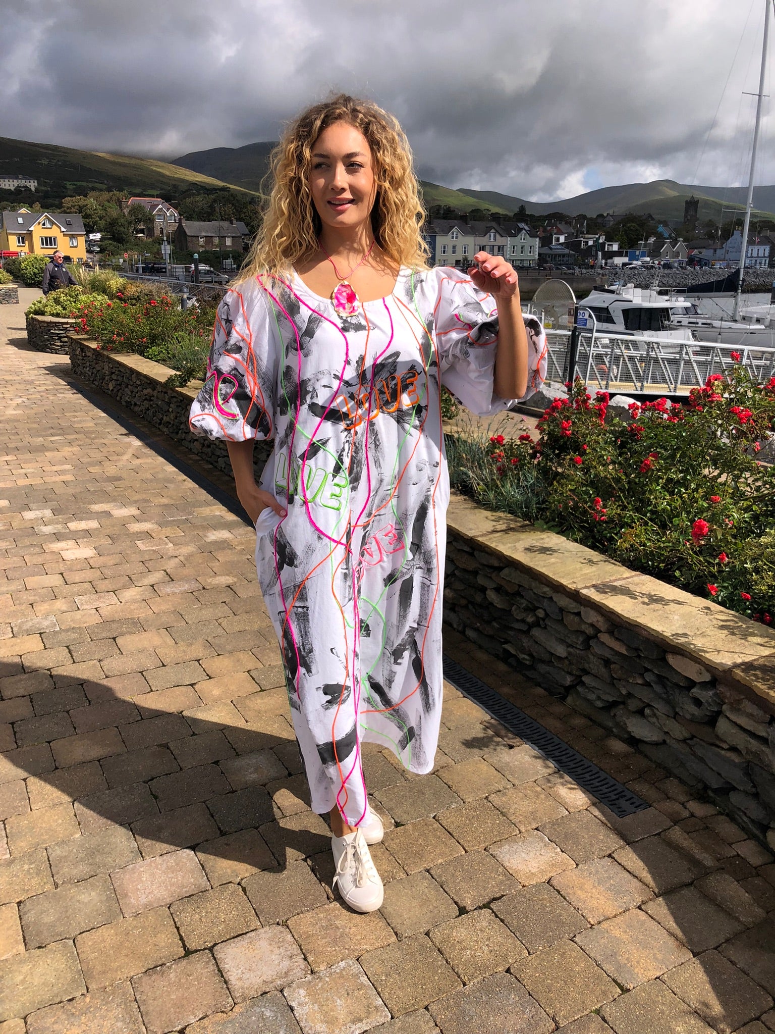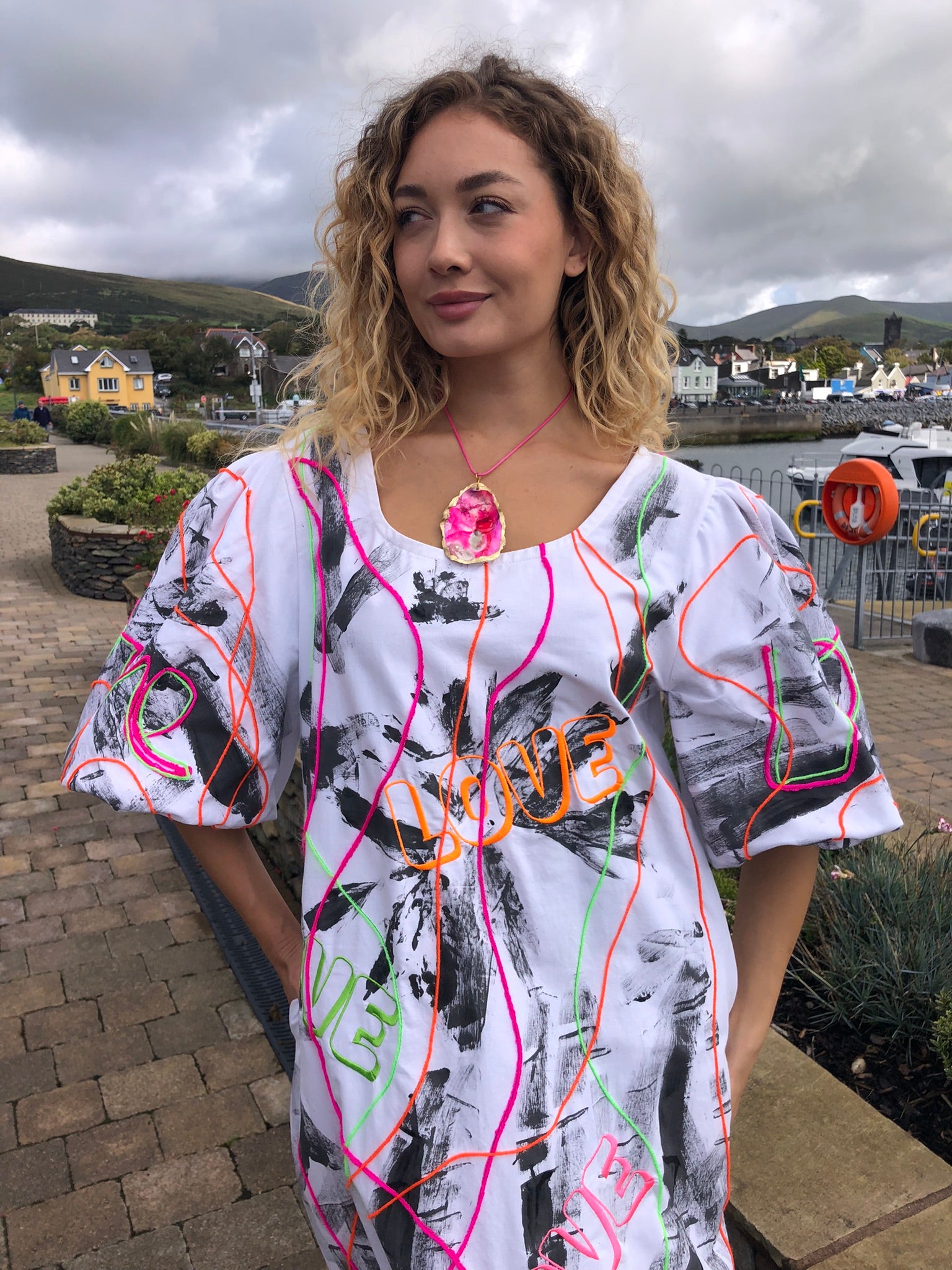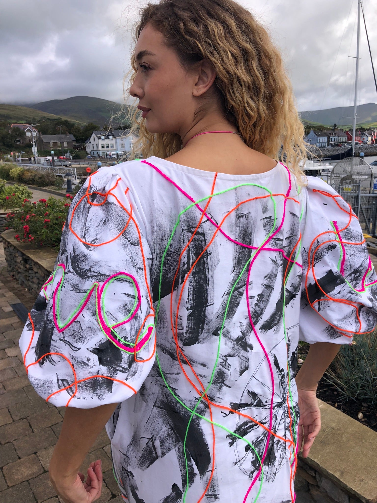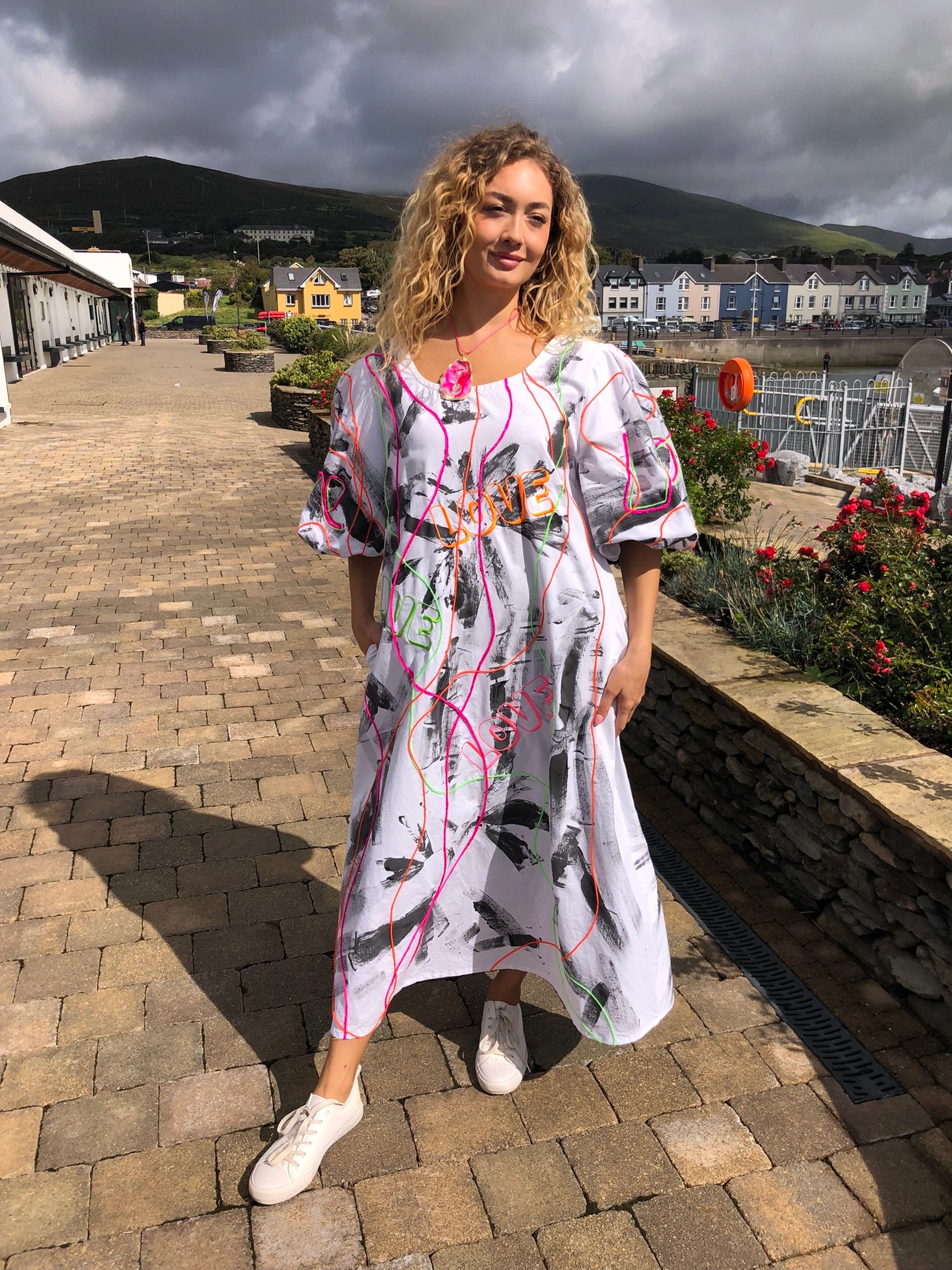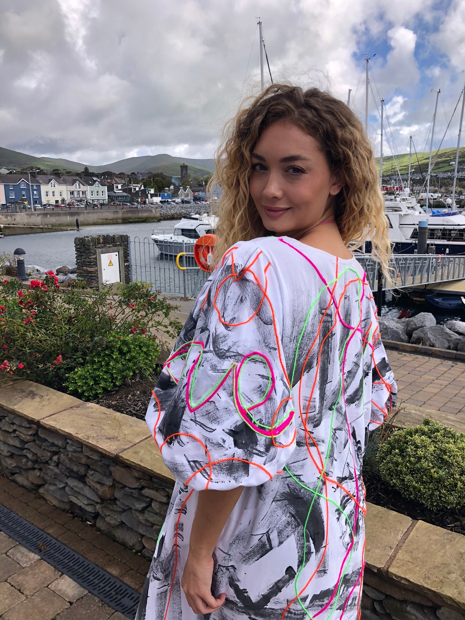 Made with upcycled 100% cotton fabric, it drapes effortlessly in a free-size fit, offering comfort and freedom of movement while making a bold artistic statement. Whether worn to an art exhibition, a summer festival, a gallery opening, or simply to turn heads on a night out, this is a dress that refuses to go unnoticed. Sustainably created and hand-finished in Dingle, it’s more than fashion — it’s wearable art with a message.