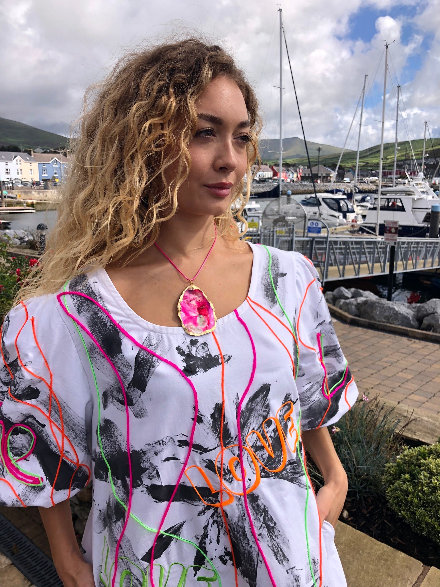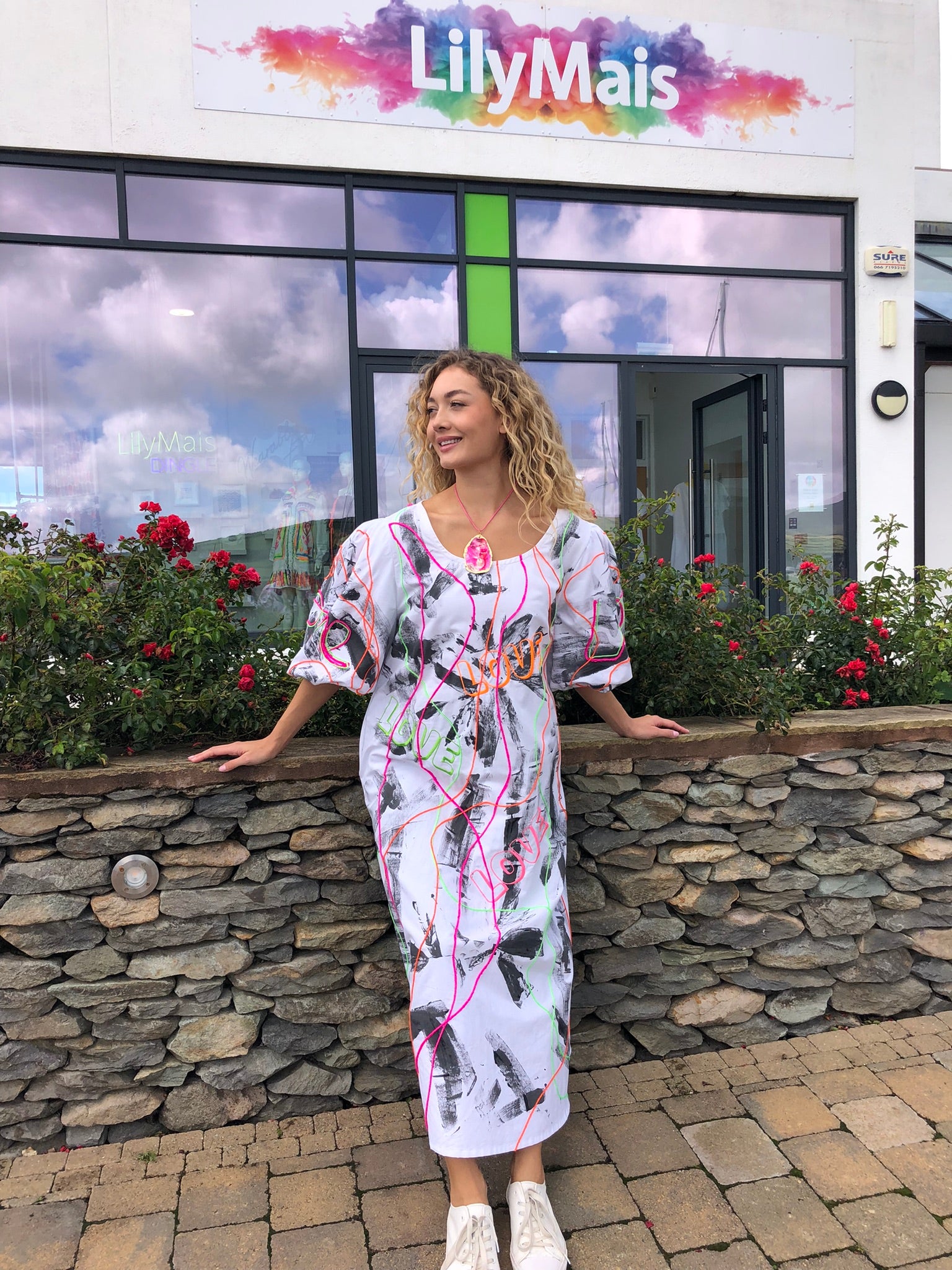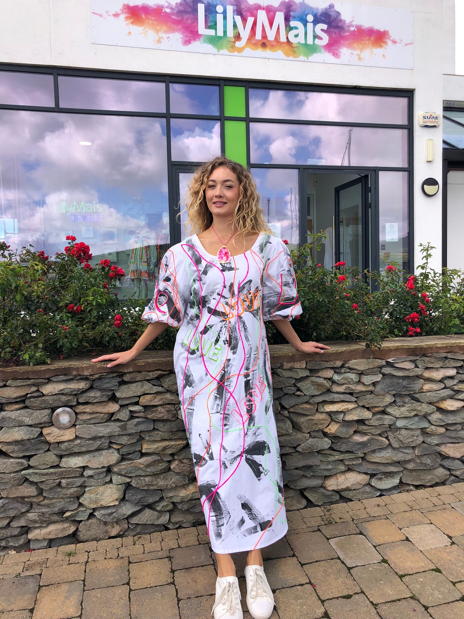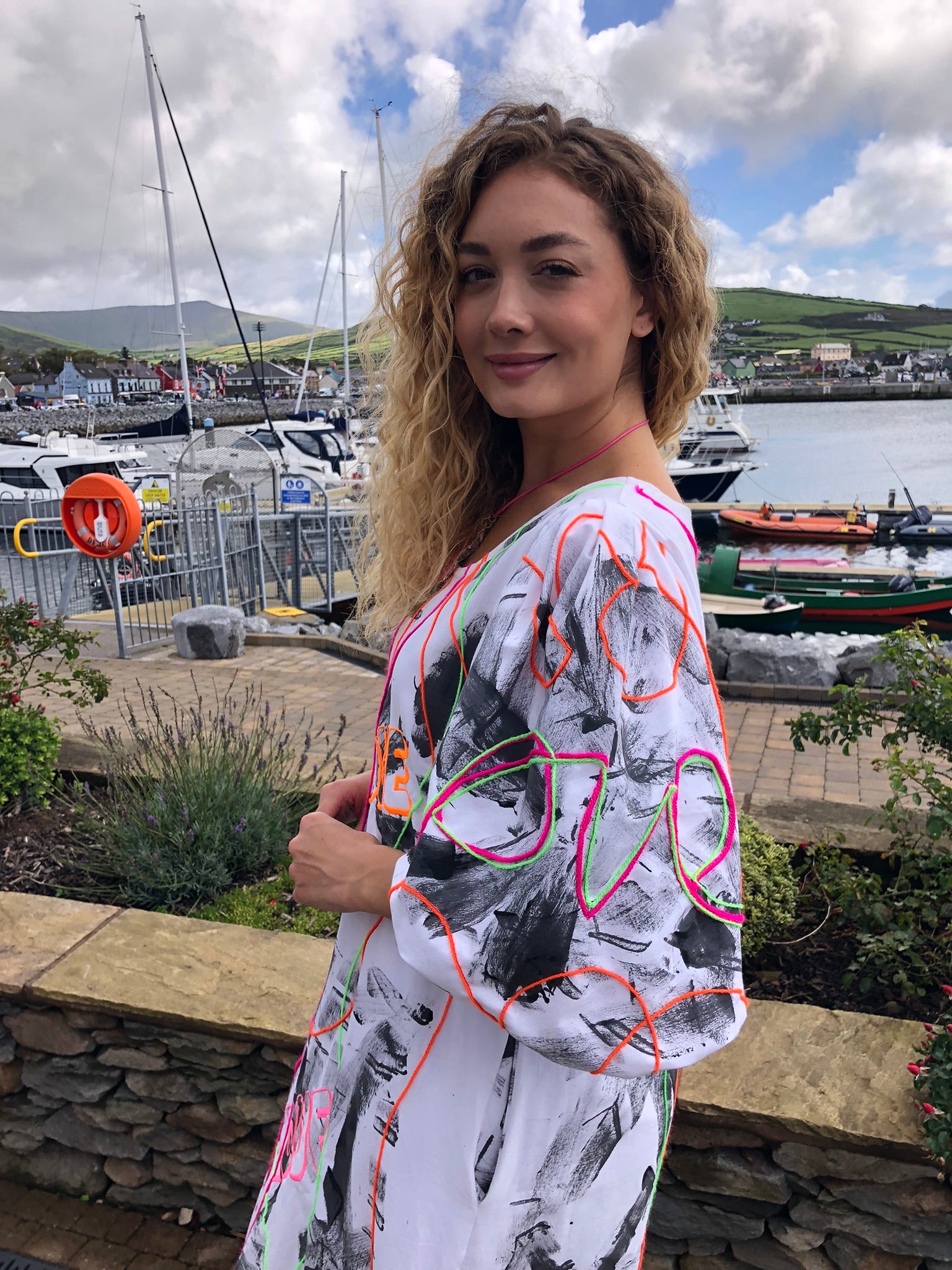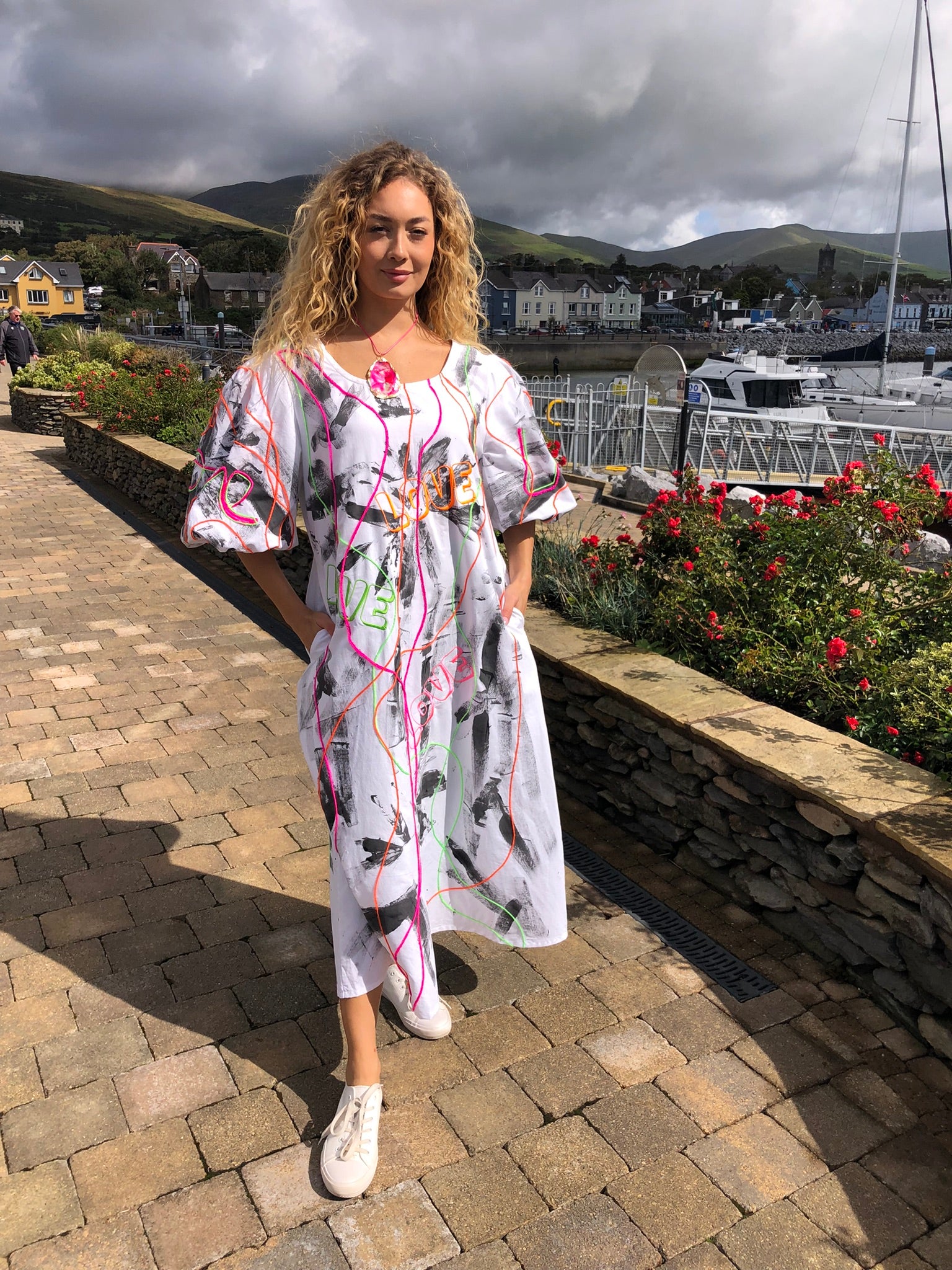 Made with upcycled 100% cotton fabric, it drapes effortlessly in a free-size fit, offering comfort and freedom of movement while making a bold artistic statement. Whether worn to an art exhibition, a summer festival, a gallery opening, or simply to turn heads on a night out, this is a dress that refuses to go unnoticed. Sustainably created and hand-finished in Dingle, it’s more than fashion — it’s wearable art with a message.