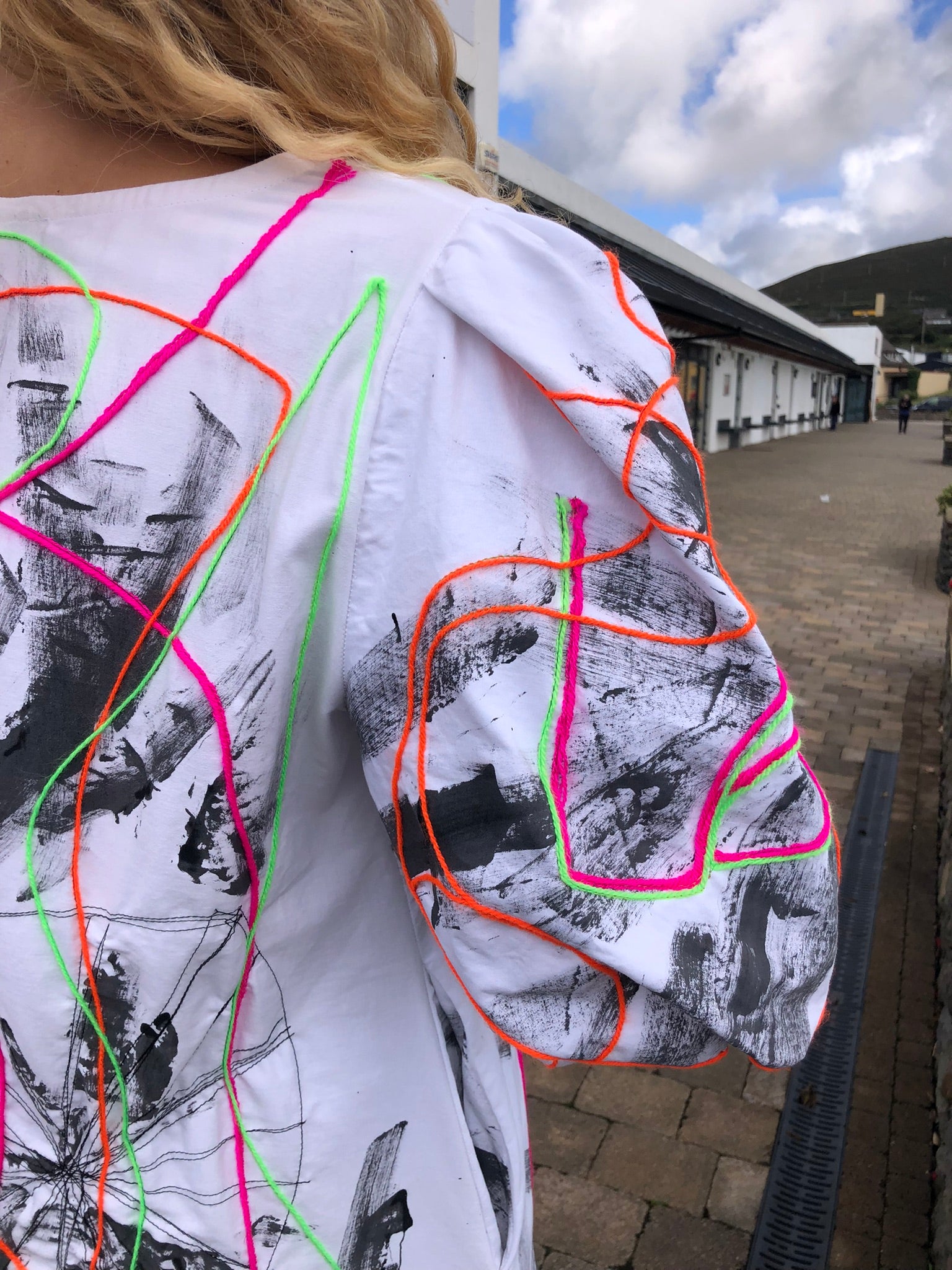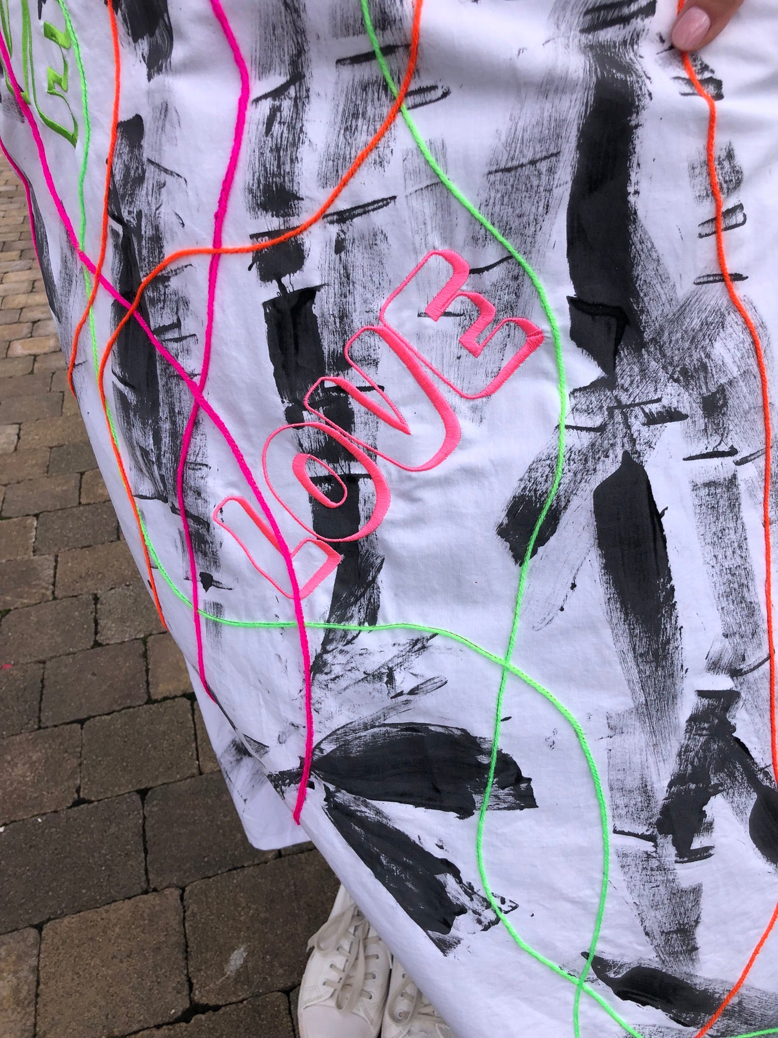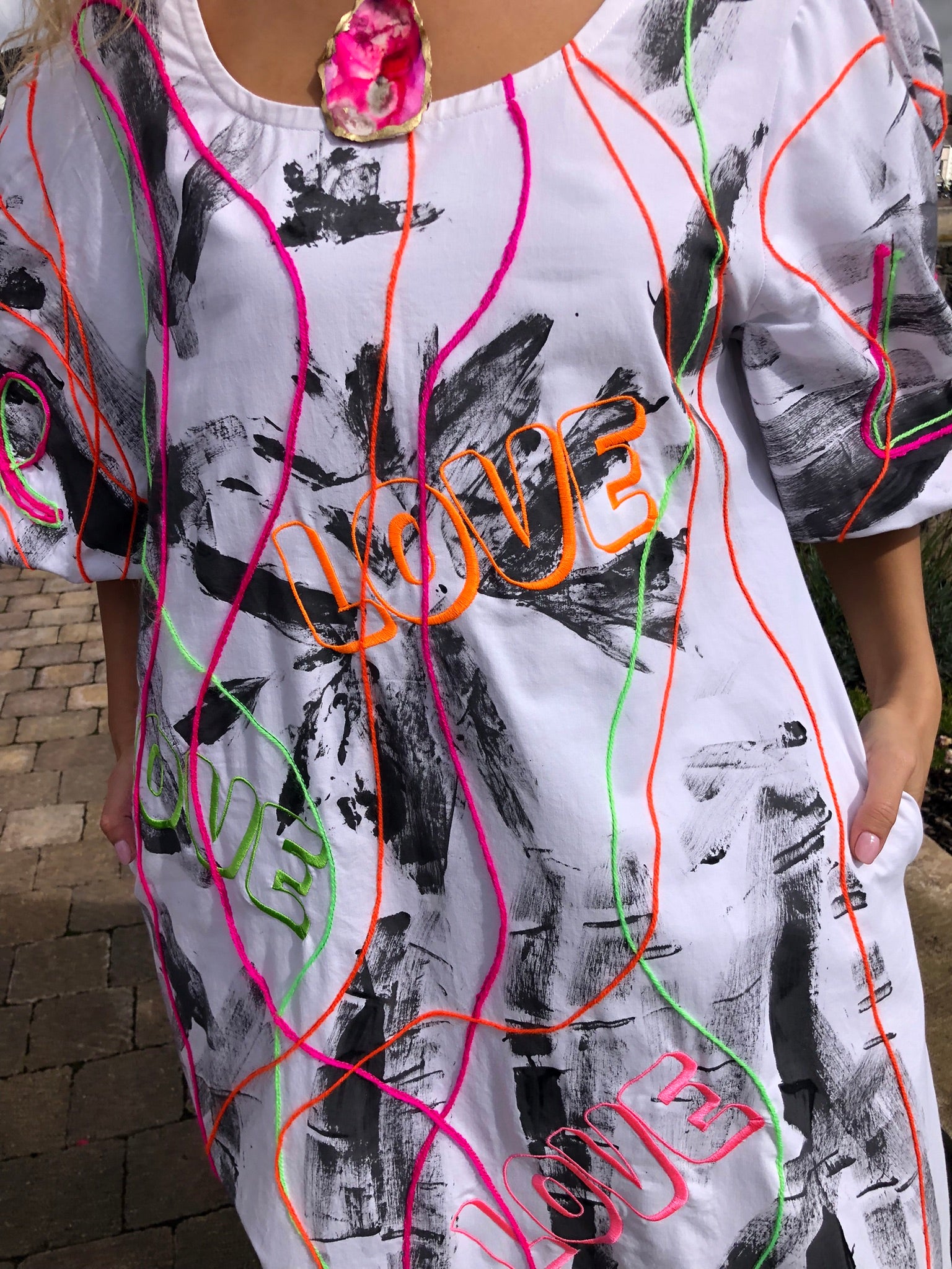 This one-of-a-kind statement dress is a joyful celebration of colour, texture, and creativity. Hand-painted in expressive black brushstrokes across a crisp white base, it’s brought to life with the word LOVE embroidered in neon thread, glowing in vibrant shades of orange, pink, and green. Woollen couching in playful, looping lines adds a three-dimensional element, turning the dress into a moving canvas of texture and energy.