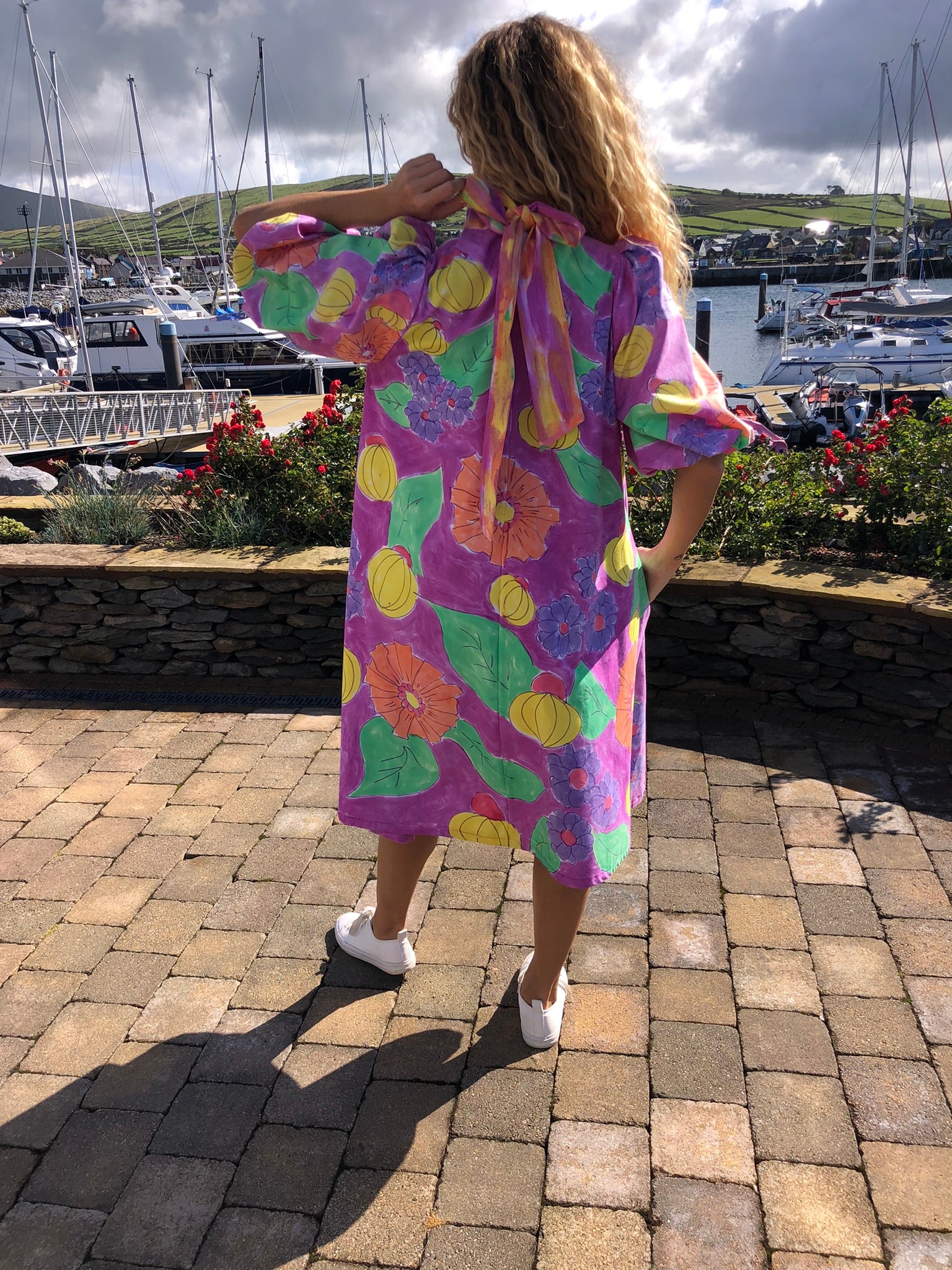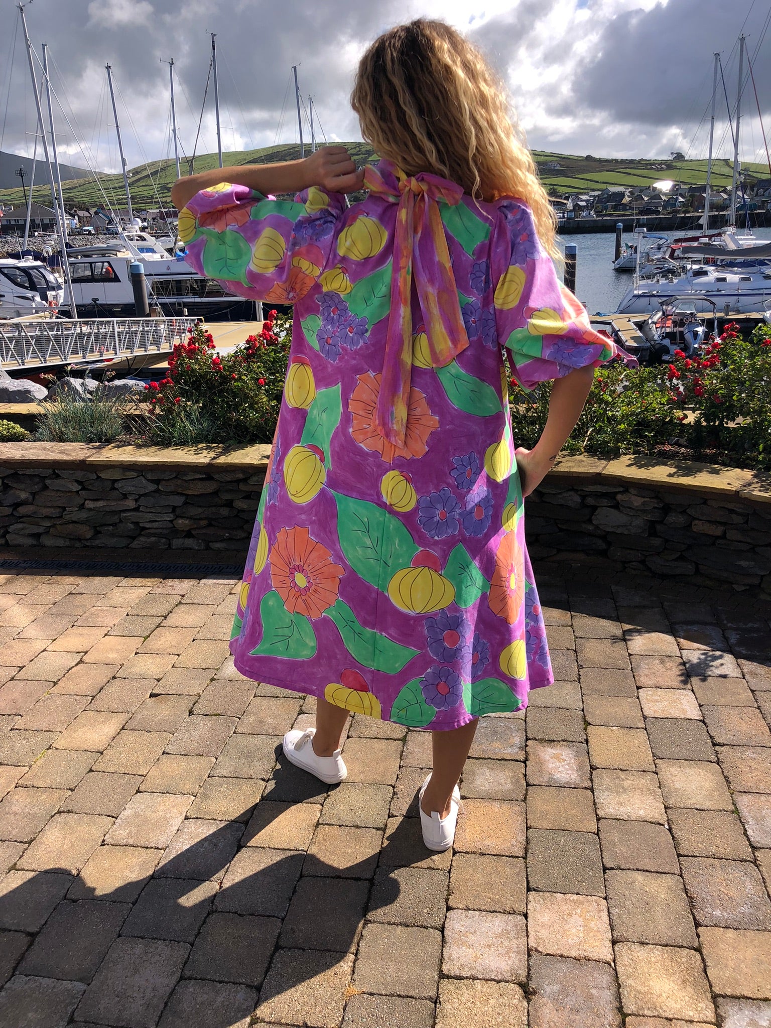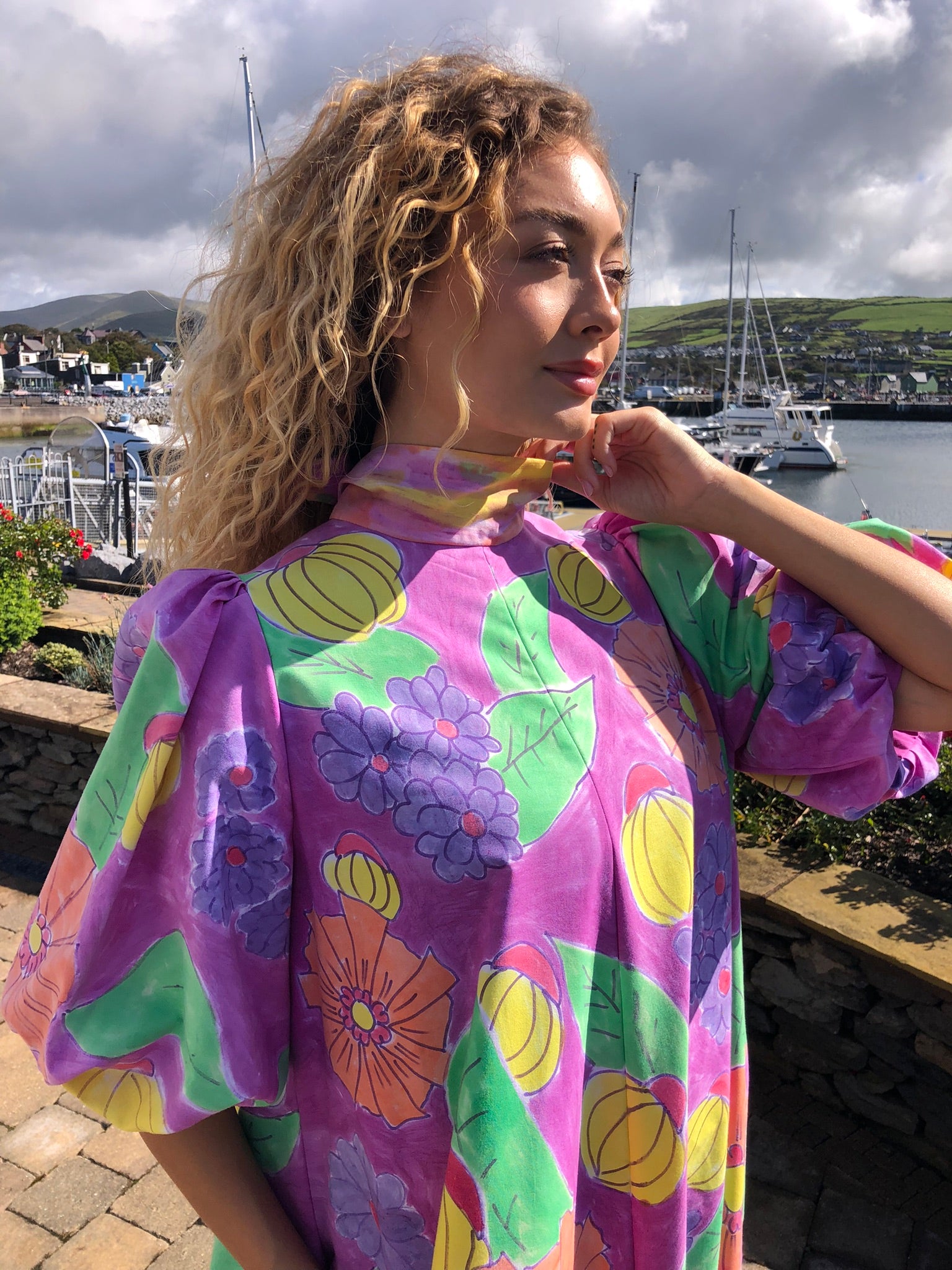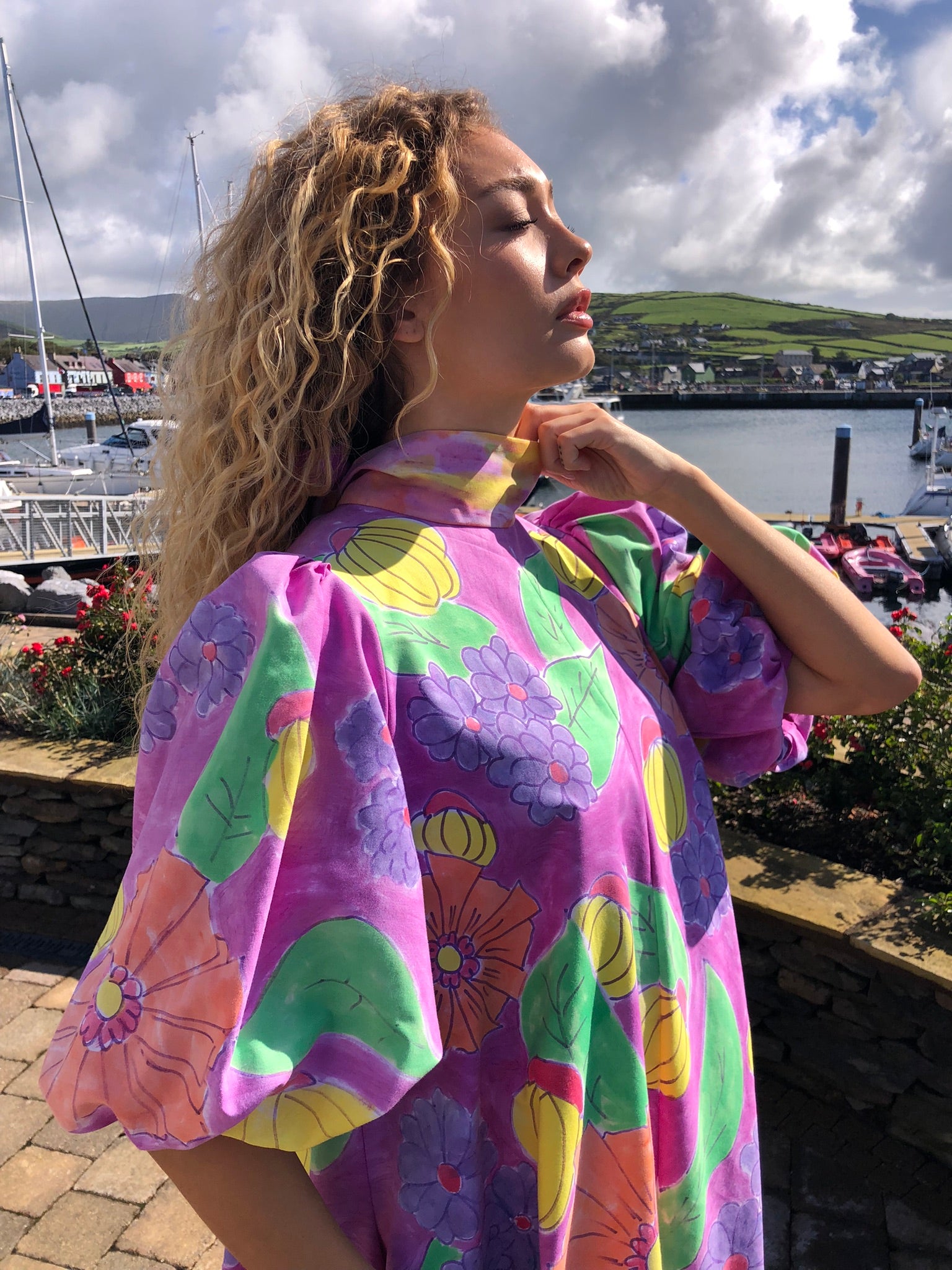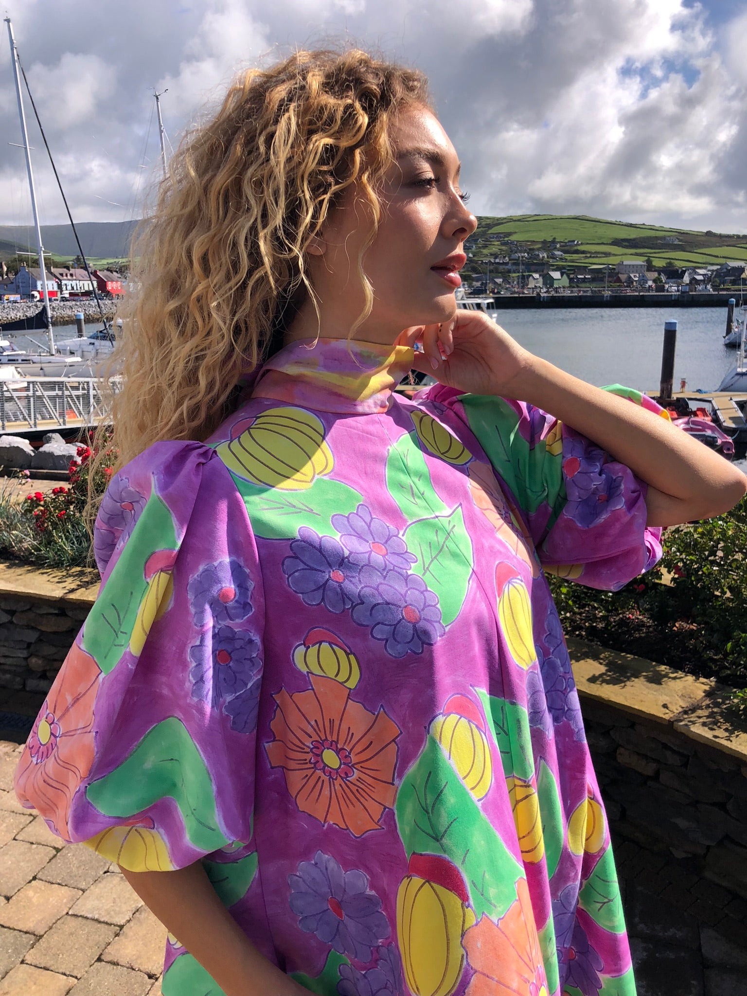 A true statement piece, it balances playful artistry with timeless charm, making it perfect for summer gatherings, creative events, or simply brightening everyday style. Sustainably created and hand-finished in Dingle, this one-off design blends colour, craftsmanship, and circular fashion into something unforgettable.