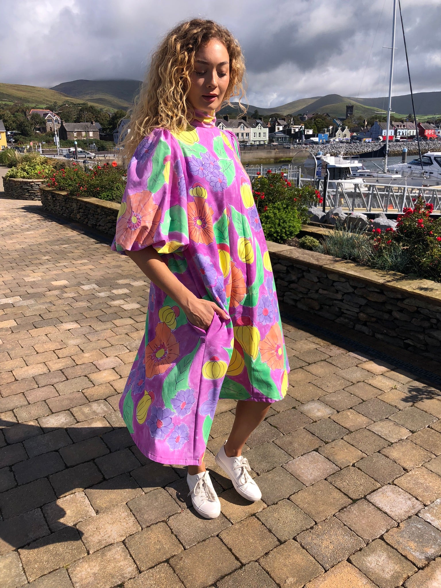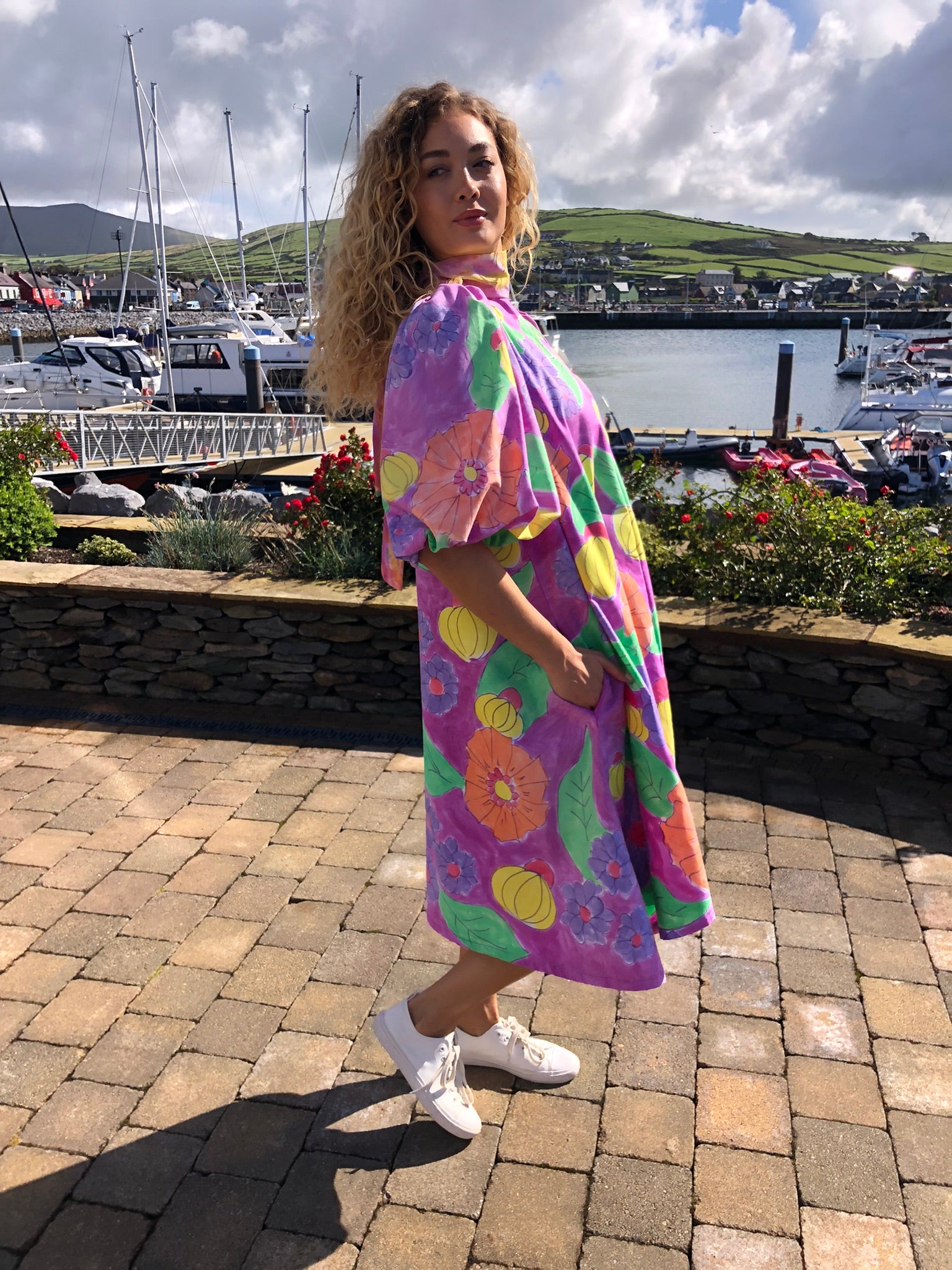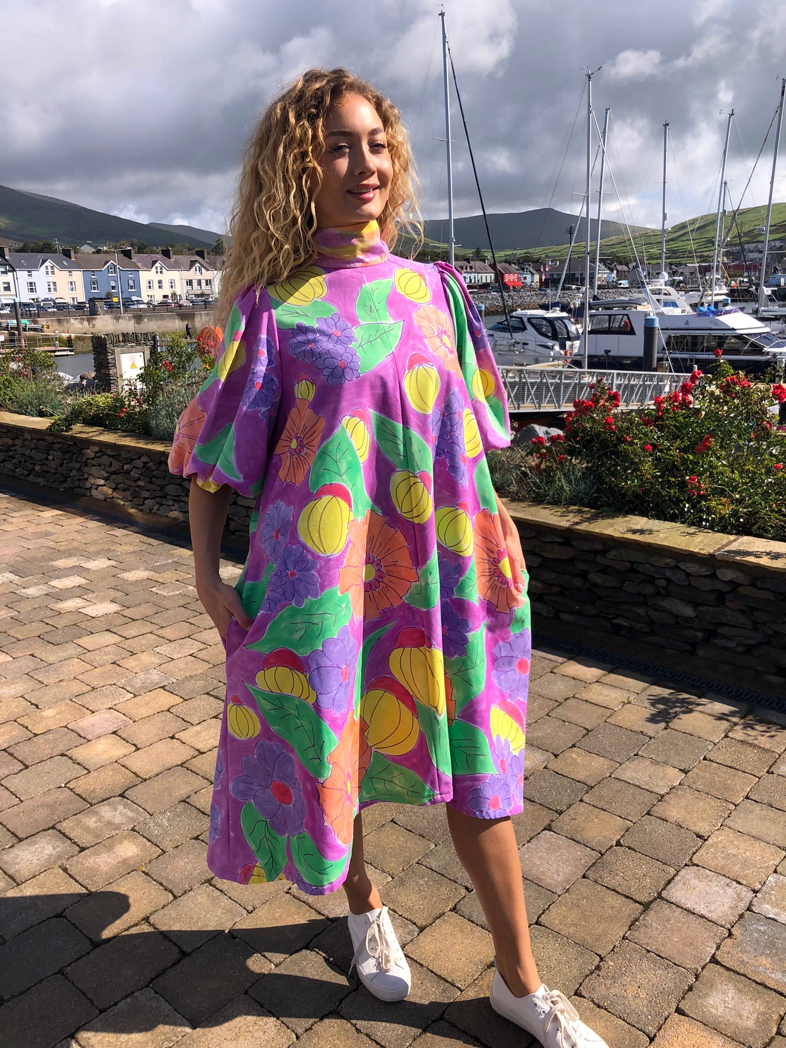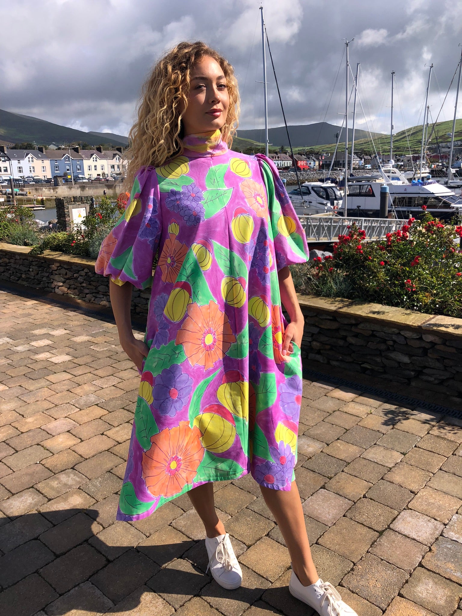 A true statement piece, it balances playful artistry with timeless charm, making it perfect for summer gatherings, creative events, or simply brightening everyday style. Sustainably created and hand-finished in Dingle, this one-off design blends colour, craftsmanship, and circular fashion into something unforgettable.