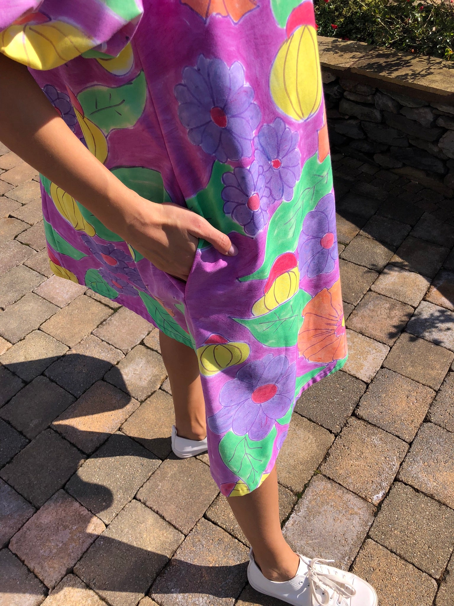 This free-size dress is an explosion of colour and joy, hand-painted with oversized florals and bold fruit motifs in rich purples, golden yellows, bright oranges, and lush greens. Made from 100% upcycled cotton, it’s as light and breathable as it is eye-catching. The flowing cut makes it easy to wear, while puffed sleeves and a tie neckline bring a touch of vintage-inspired elegance.