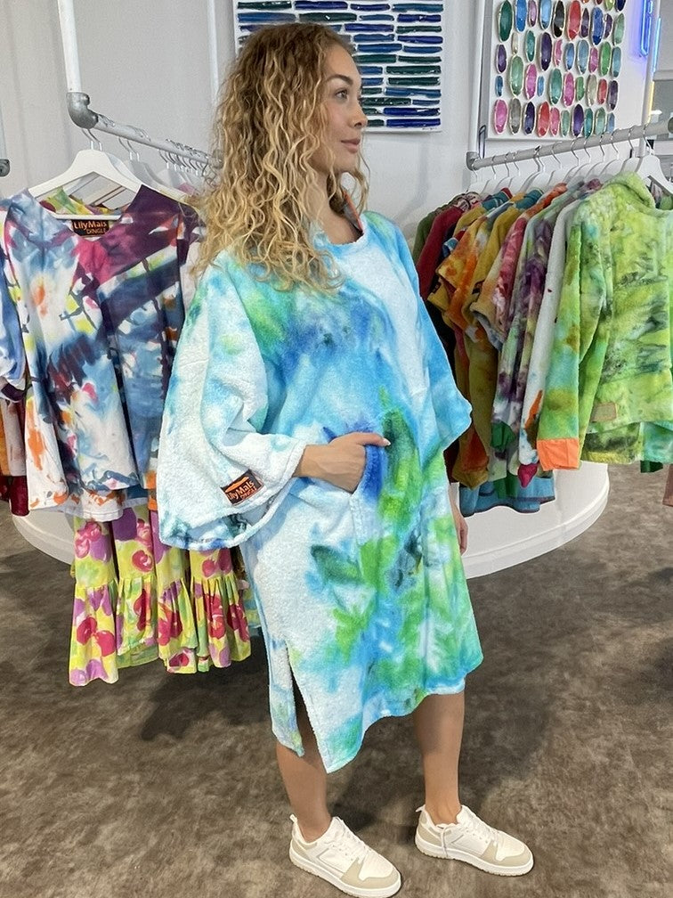 This adult-sized swim poncho is a soothing, ocean-toned original created through the ice-dye process, blending soft sky blues, fresh greens and inky sea-depth navy. The colour movement has a gentle, watercolour flow — like sunlight drifting through shallow tides — giving the whole piece a calm, coastal, quietly striking look. Every section has taken the dye differently, making this a true one-off with its own natural patterning.