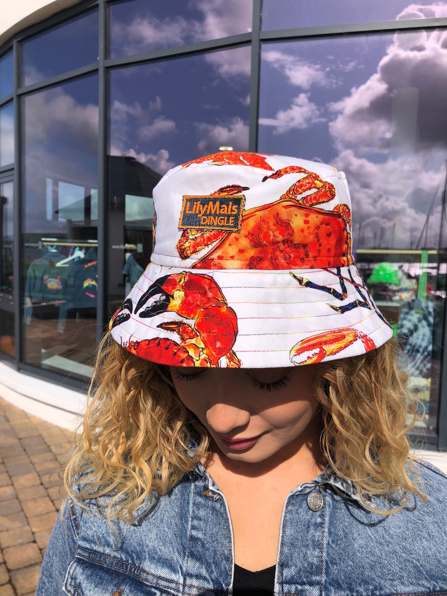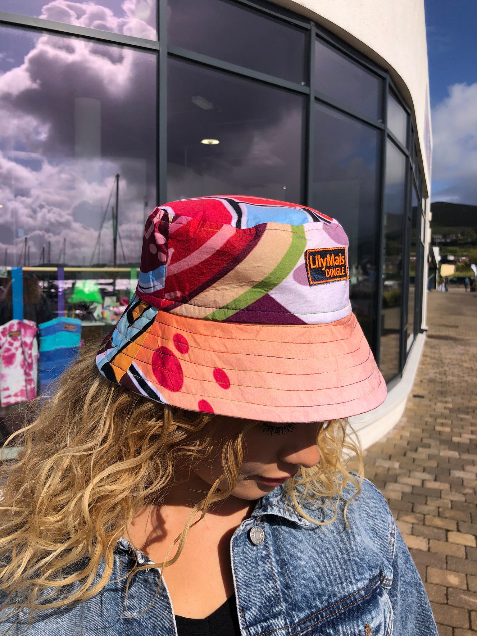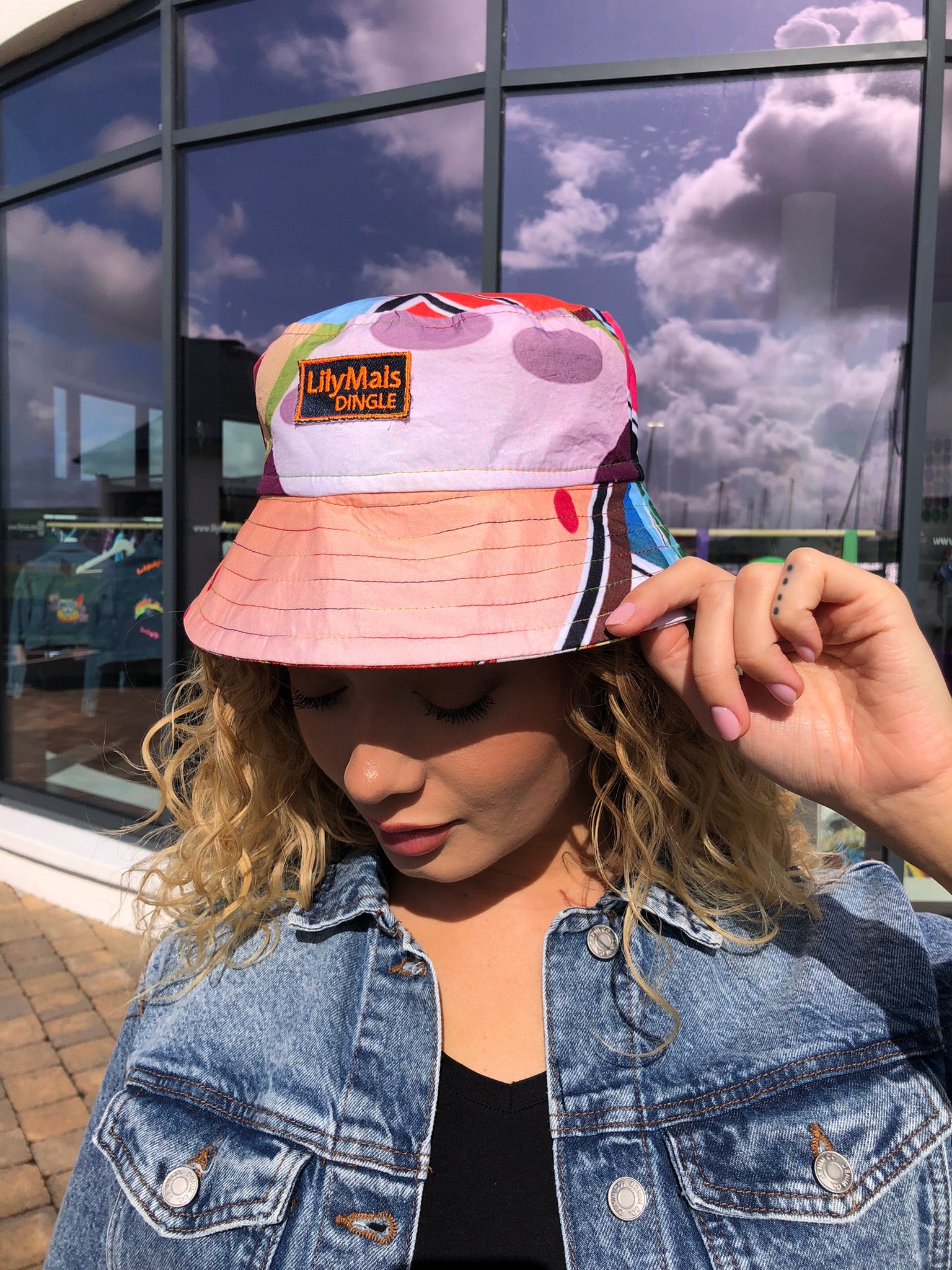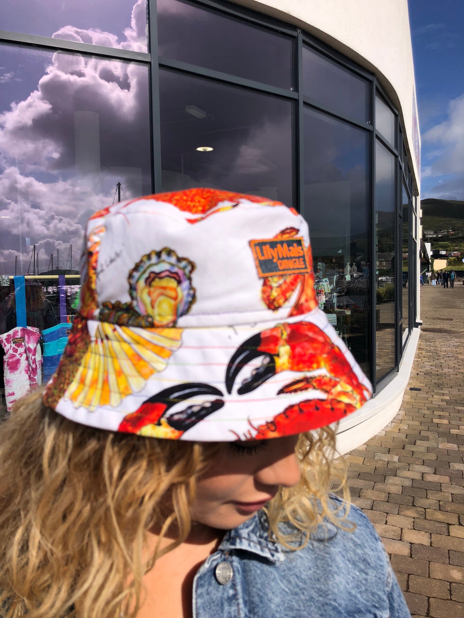 This adult-size reversible bucket hat is a true celebration of colour, creativity, and sustainability. Handmade in Dingle from 100% upcycled cotton, it offers two distinct looks in one. On one side, bold abstract shapes in reds, pinks, and pastels create a vibrant, artistic feel. Flip it over and you’ll find a playful seafood-inspired print featuring lively crabs and sea creatures, perfect for coastal vibes. Lightweight and breathable, this hat is designed for comfort while making a statement.