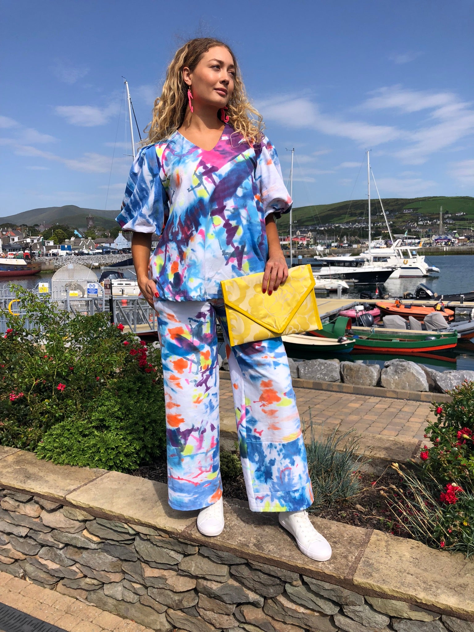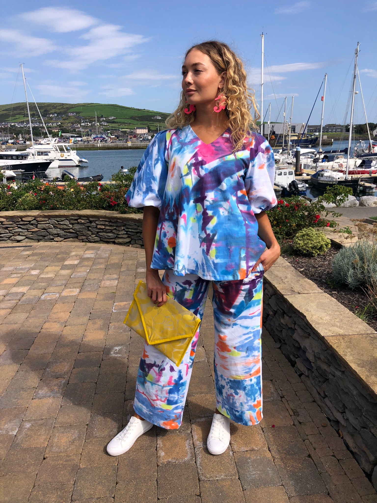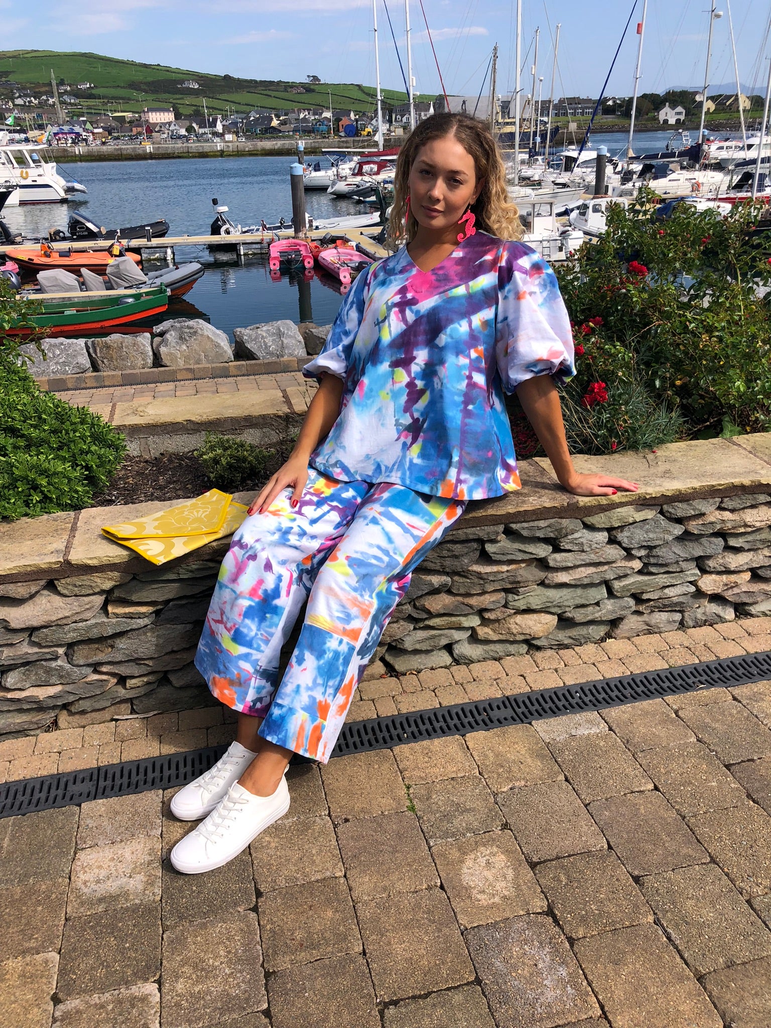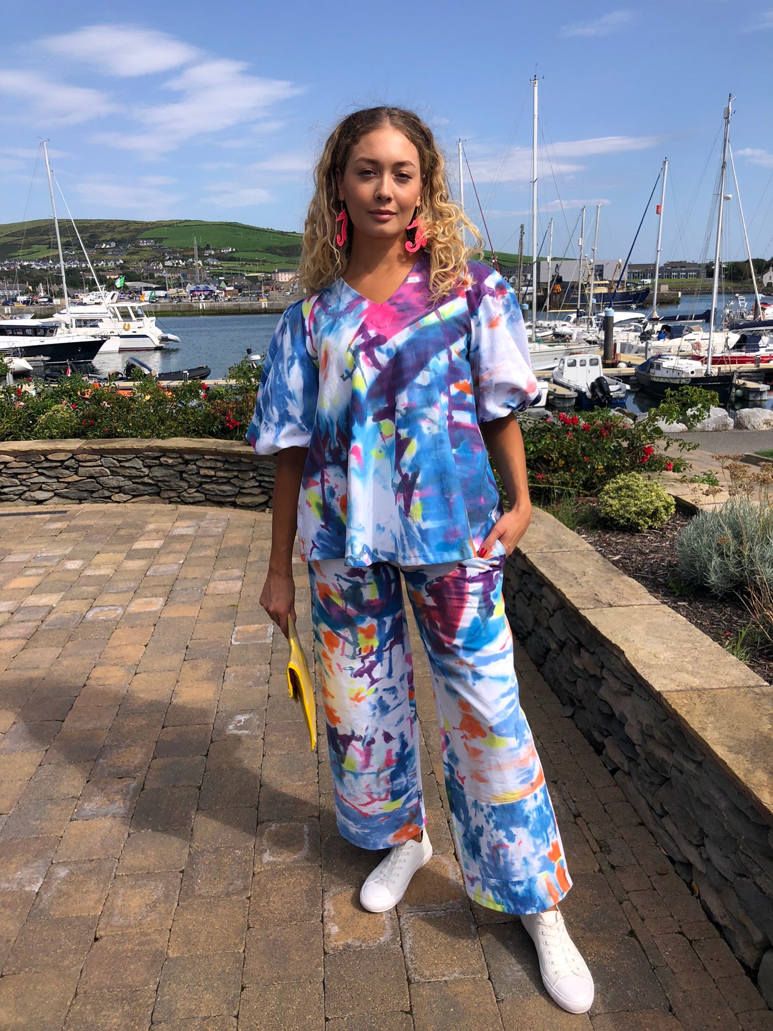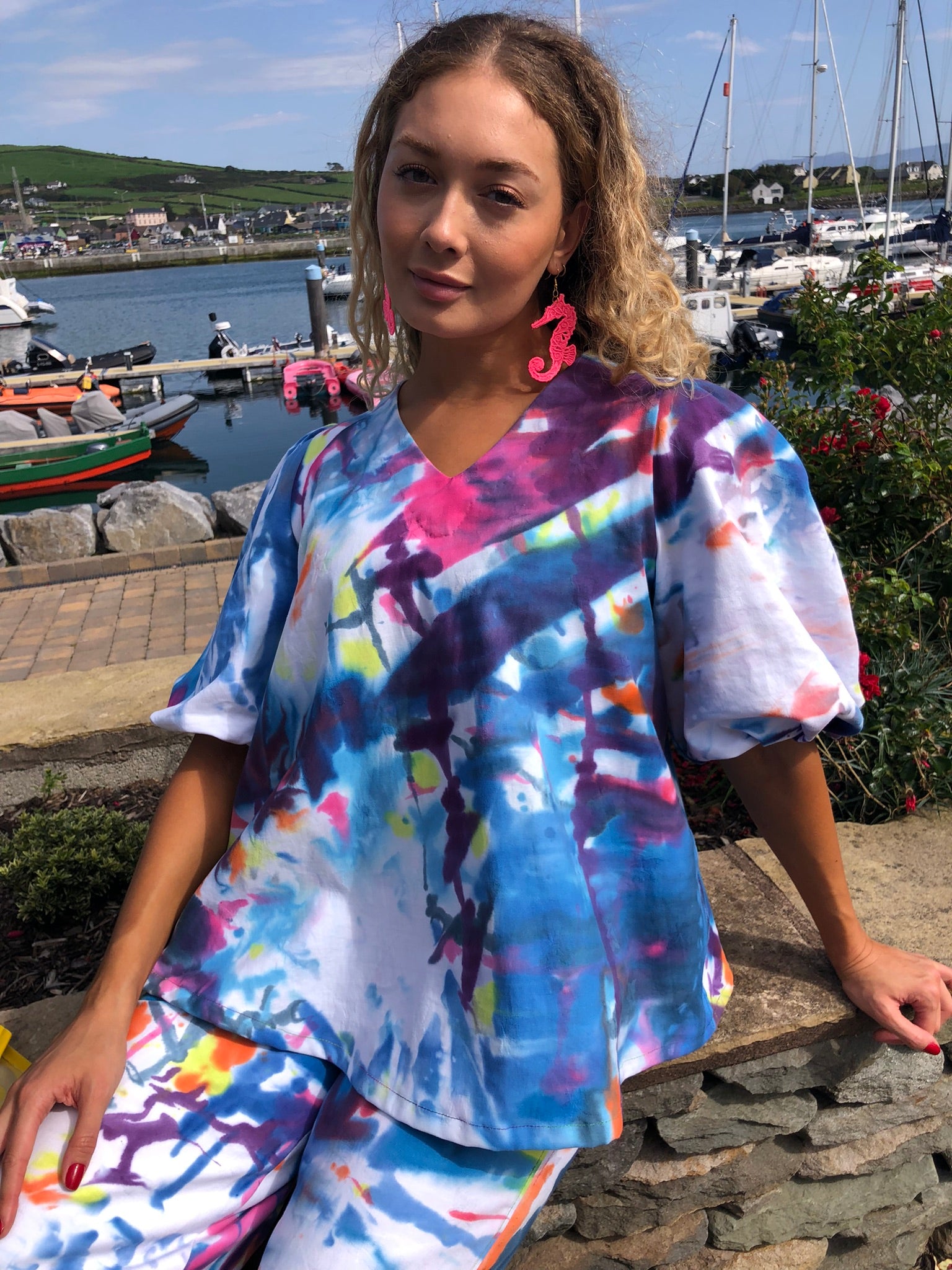 Make a splash in this vibrant two-piece outfit, a one-of-a-kind set hand-painted on soft, breathable upcycled cotton fabric. Bursting with ocean blues, coral pinks and sunny citrus tones, every brushstroke is unique, ensuring no one else will ever own the same piece. The relaxed V-neck top with voluminous sleeves flows effortlessly into wide-leg trousers for all-day comfort and style, and each element can also be worn separately – the top pairs beautifully with your favourite skinny jeans, while the trousers work perfectly under a simple t-shirt.